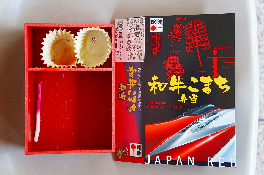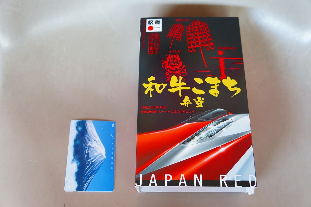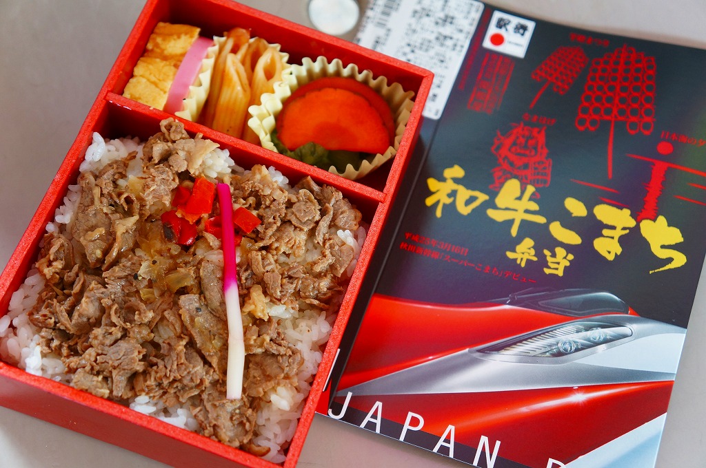 秋田新幹線「スーパーこまち」のデビューに合わせ、2013(平成25)年3月に発売。パッケージには、秋田を表すいくつかのアイコンに加え、E6系新幹線電車CGの先頭部アップが描かれる。赤い容器の中身は、白御飯にオニオンソースの牛焼肉を置き、ペンネ、かまぼこ、玉子焼、いぶりがっこなどを添えるもの。中身の写真のとおり、薄毛の牛肉から白飯の地肌がよく見える、寂しい牛丼。しかし秋田県産和牛の味は、パッケージ記載「秋田こまち米」とともに柔らかく確かだった。価格は2013年の発売時や購入時で1,000円、2014年時点で1,050円、2017年時点で1,100円、2020年時点で1,140円。2021年までに販売を休止し、2022年で終売か。