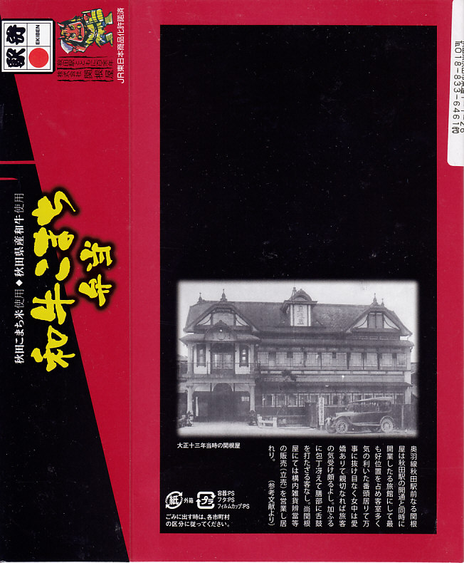 東京駅から新幹線こまち号で約4時間。秋田市は秋田県の中央で日本海に面した、人口約29万人の城下町で県庁所在地。北前船以来の港町でもあり、油田を抱えた工業都市でもあり、以前は商業でも賑わった。駅弁は明治時代の末期までに関根屋が売り始め、以後は大正時代から21世紀までいくつもの業者が進出しては消え、今は関根屋と大館駅の駅弁が駅のコンビニで売られる。1902(明治35)年10月21日開業、秋田県秋田市中通7丁目。