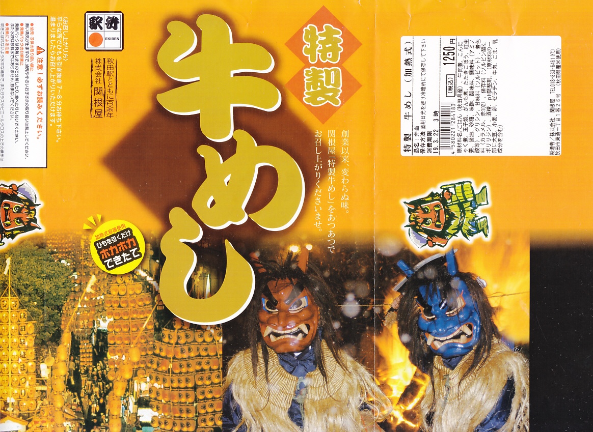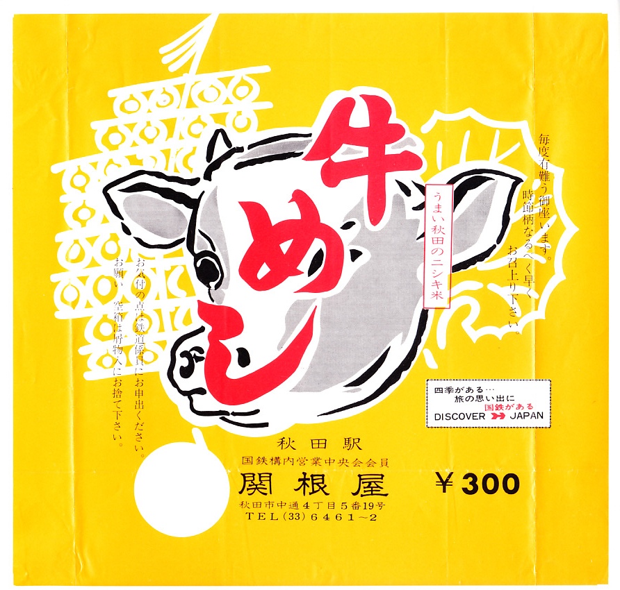 1970年代のものと思われる、昔の秋田駅弁の掛紙。300円の価格から、1973年頃のものか。後年のものでもよく使われる。牛顔に竿灯とアキタブキ?の絵柄を持つ黄色い掛紙。この絵柄は上記のとおり、何度も復刻されている。