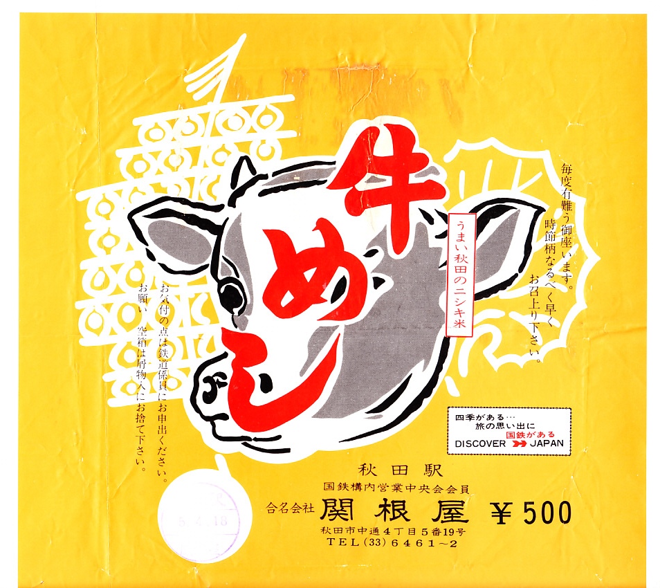 1976(昭和51)年5月4日の調製と思われる、昔の秋田駅弁の掛紙。絵柄は下記の1970年代や上記の復刻版と同じ。国鉄の観光キャンペーン「ディスカバー・ジャパン」のロゴに「四季がある…旅の思い出に国鉄がある」という見慣れない文句が付く。