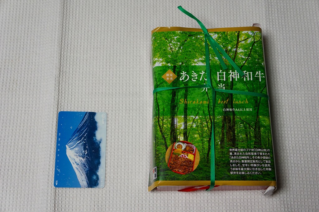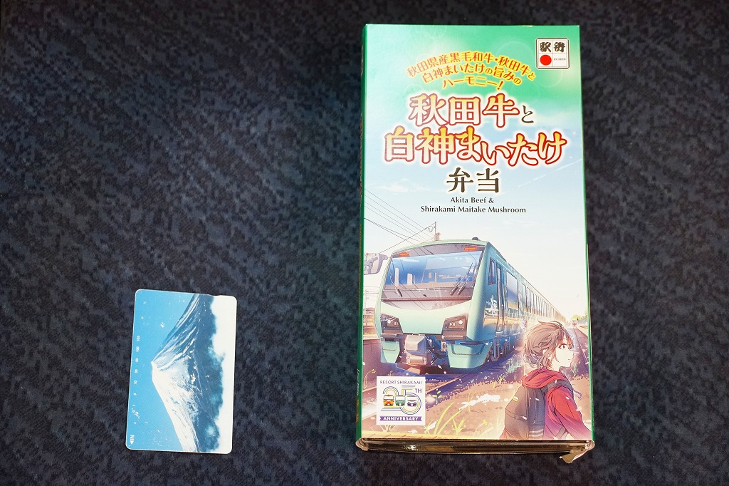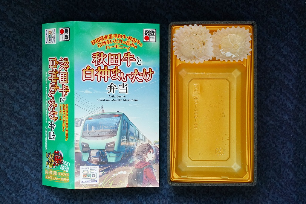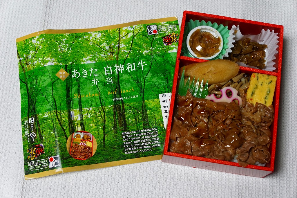 東京駅の駅弁売店「駅弁屋 祭」での、2022(令和4)年の駅弁の日にちなむ4月6〜19日の「春の新作駅弁大会」において発売か。スリーブの絵柄は秋田駅と五能線を結ぶ観光列車「リゾートしらかみ」で、その25周年ロゴマークがいくつもあるので、これを記念した駅弁だろうか。白飯を秋田牛と白神まいたけとささがきごぼうの煮物で覆い、いぶり人参漬とアスパラで彩り、こごみ胡麻和えとりんごコンポートを添える。秋田駅で量がやや物足りない牛肉弁当に、マイタケで増量し水気と柔らかさを加え、食べ応えを加えた印象。値段がずいぶん張るなとは思う。2023年3月限りで終売。