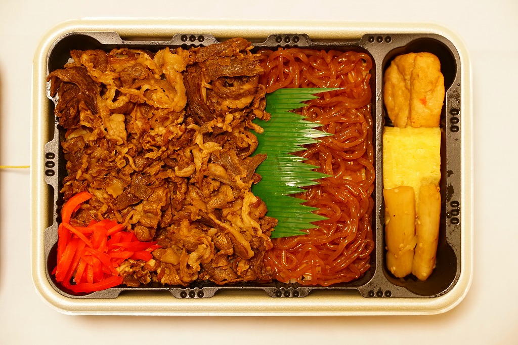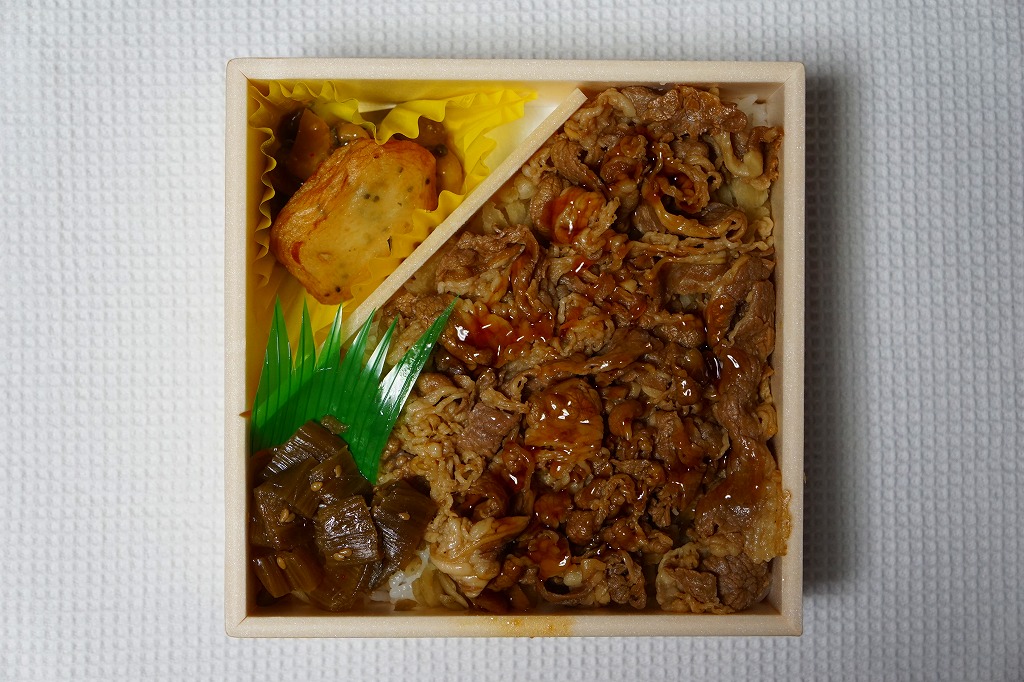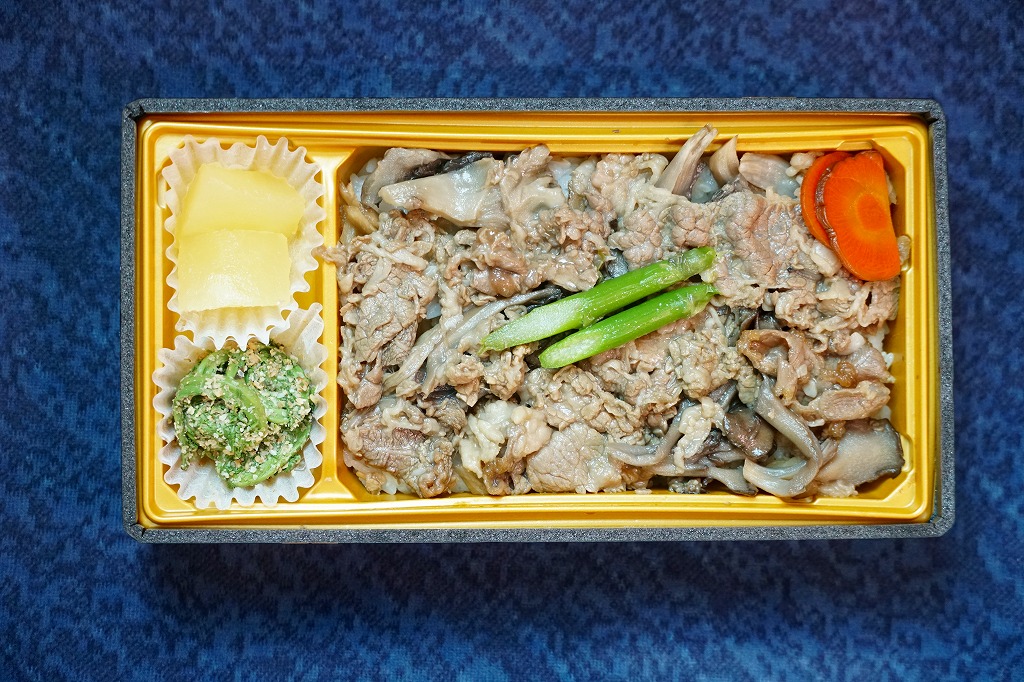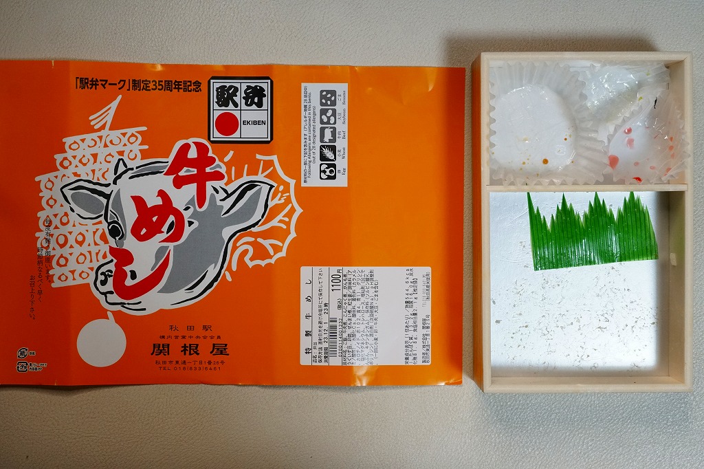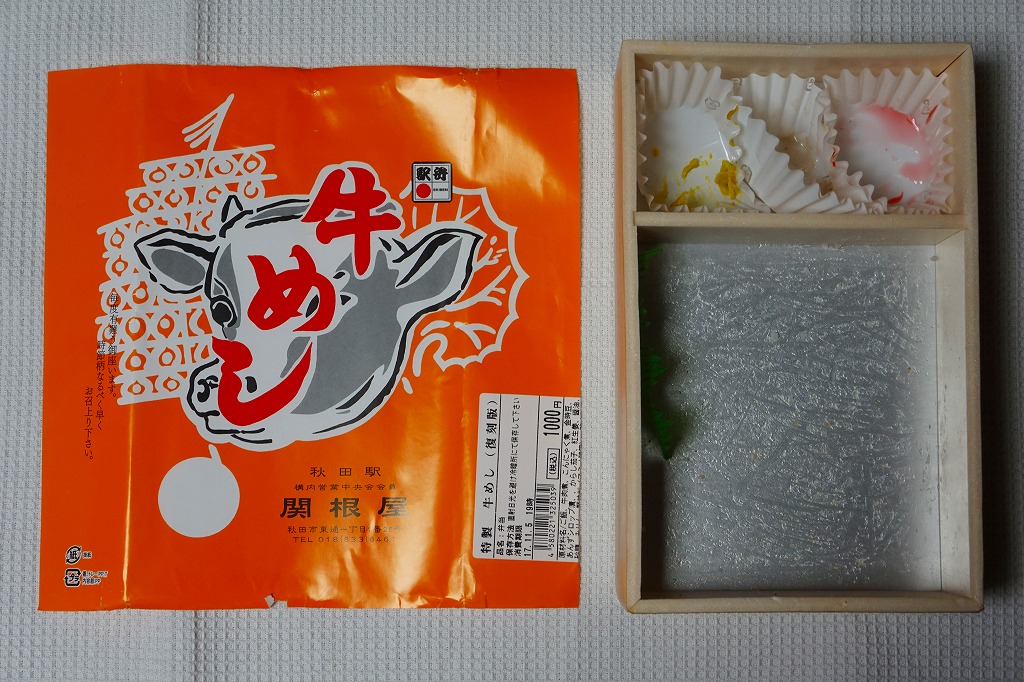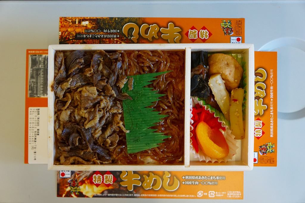 秋田駅の牛肉駅弁。駅弁屋の創業時の1902(明治35)年に発売と紹介されることがあるが、文献で確認できる駅弁の歴史を、1920年頃の鶏肉から始まる肉駅弁の歴史を鑑みると、どうも信じがたい。白飯を牛肉煮と糸こんにゃくで覆い、こんにゃく、ごぼう、昆布、がんも、ぜんまい、紅生姜、あんずシロップ煮を添える。特徴の薄さが特徴かもしれない、色の濃い、味の濃い、ちょっと古めかしい牛すき焼き丼。価格は2014年の購入時で950円、2018年時点で1,000円、2022年3月から1,100円、2024年9月から1,280円。