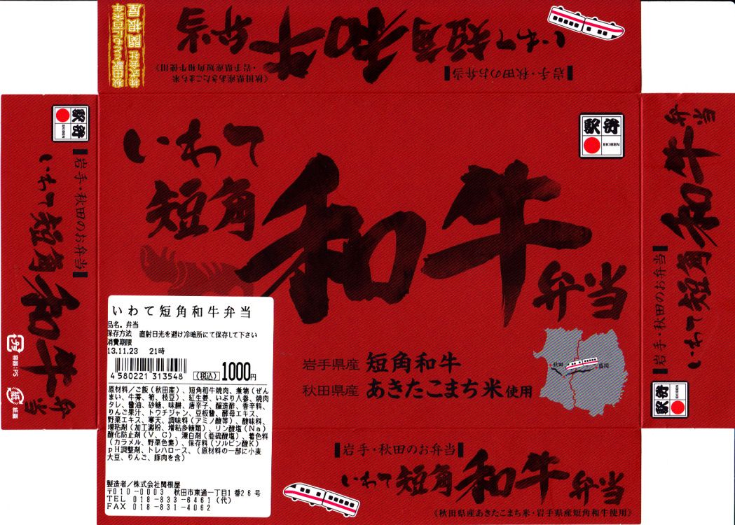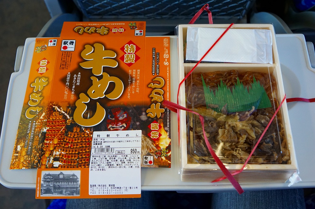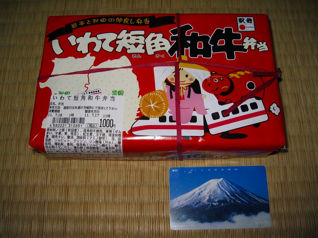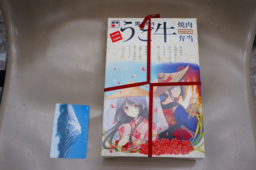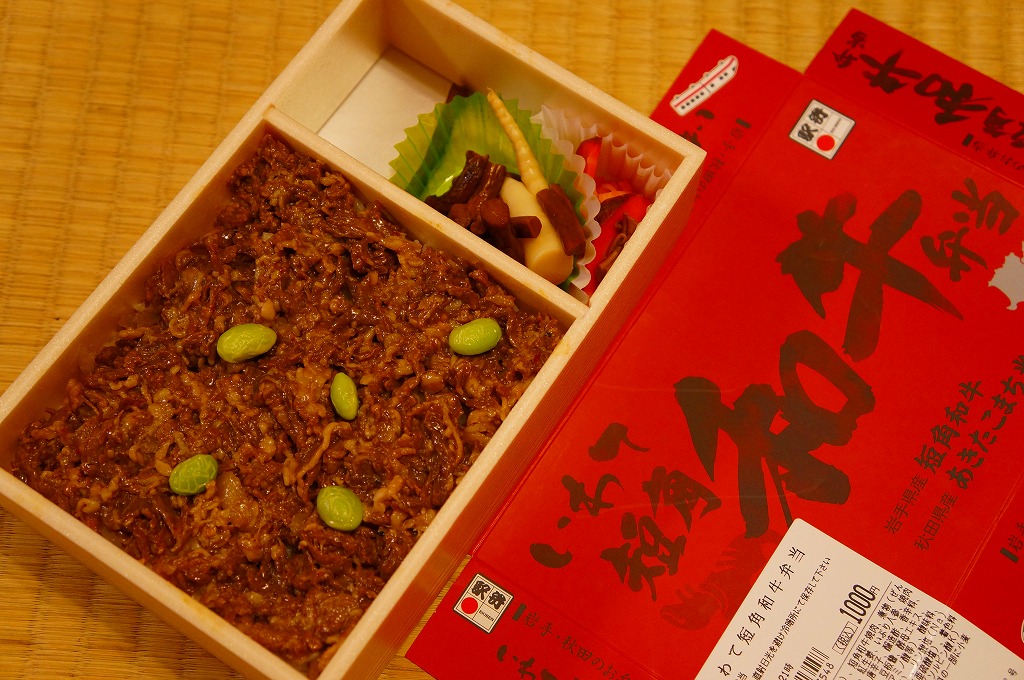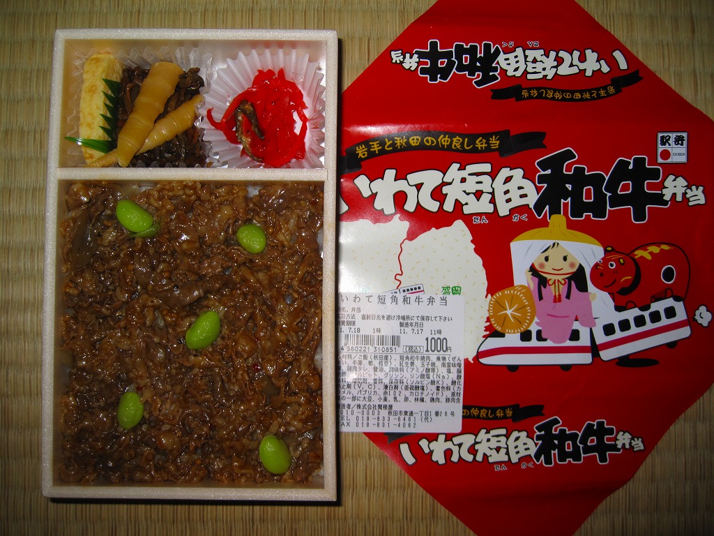 2011(平成23)年5月の発売。秋田新幹線の開業15周年でも記念したのだろうか。長方形の容器に透明なふたをして、駅弁の名前を墨字で著した赤黒いふたをさらにかける。中身は白御飯の上を岩手県岩泉の短角牛の焼肉で覆い、ゼンマイやいぶりがっこなどを添えるもの。容器も中身も米沢その他の東北地方各地の牛肉駅弁と同じ感じだが、ぐにゅっとした肉の視覚と味覚での脂が印象的。価格は2013年の発売時や購入時で1,000円、2014年時点で1,050円。2014年頃までの販売か。