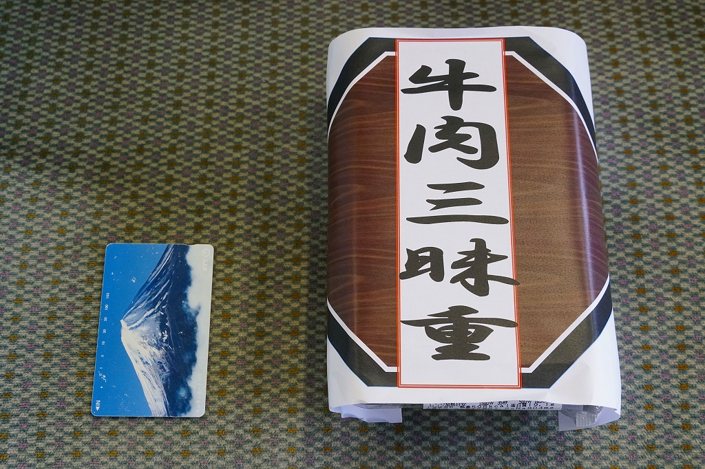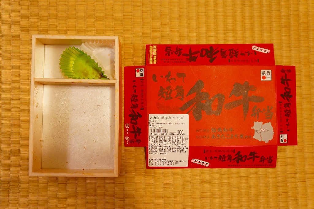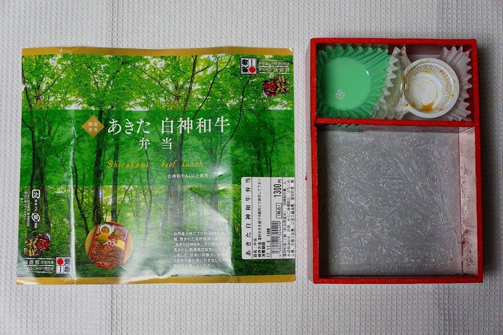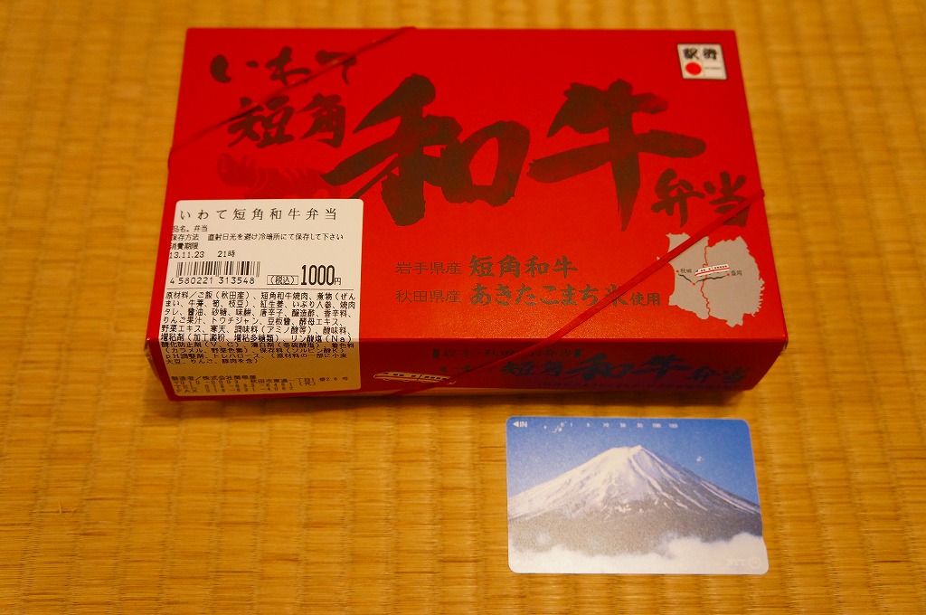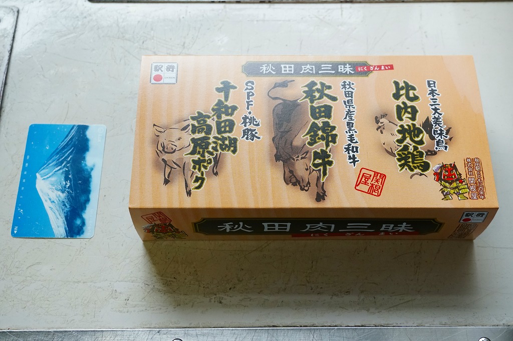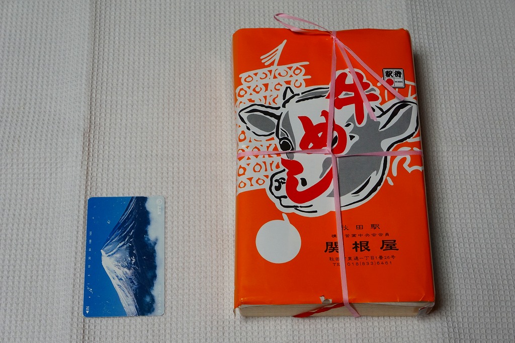 2011(平成23)年5月の発売。秋田新幹線の開業15周年でも記念したのだろうか。長方形の容器に透明なふたをして、駅弁の名前を墨字で著した赤黒いふたをさらにかける。中身は白御飯の上を岩手県岩泉の短角牛の焼肉で覆い、ゼンマイやいぶりがっこなどを添えるもの。容器も中身も米沢その他の東北地方各地の牛肉駅弁と同じ感じだが、ぐにゅっとした肉の視覚と味覚での脂が印象的。価格は2013年の発売時や購入時で1,000円、2014年時点で1,050円。2014年頃までの販売か。
