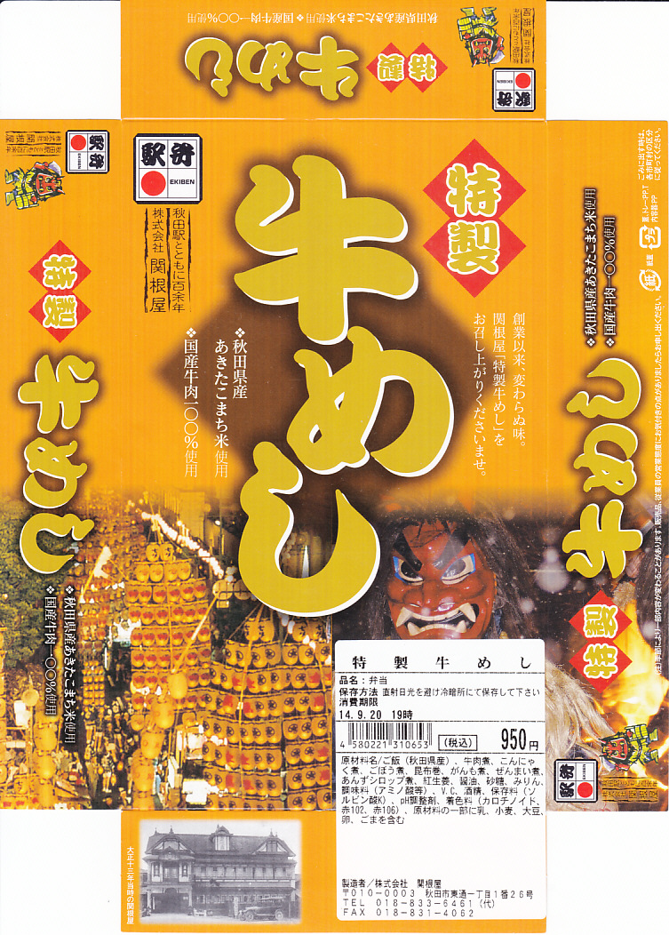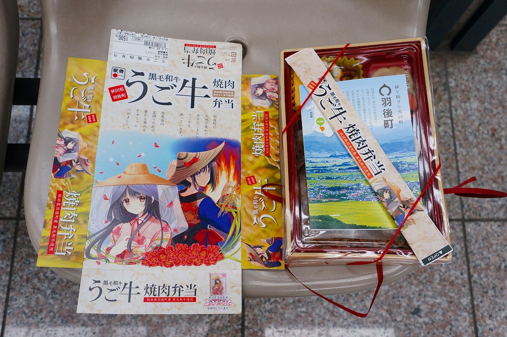 秋田駅中央改札口のコンビニエンスストア「NEWDAYS秋田中央口店」のリニューアルを記念して、2013(平成25)年4月26日に発売。長方形のプラ製容器の中身は、秋田県雄勝郡羽後町産の白御飯を、同町のうご農業協同組合のブランド牛「うご牛」の焼肉で覆い、卵、太鼓かまぼこ、ネギ入りの玉子焼、ゼンマイとゴボウの煮物、昆布巻、いぶりがっこを添えるもの。