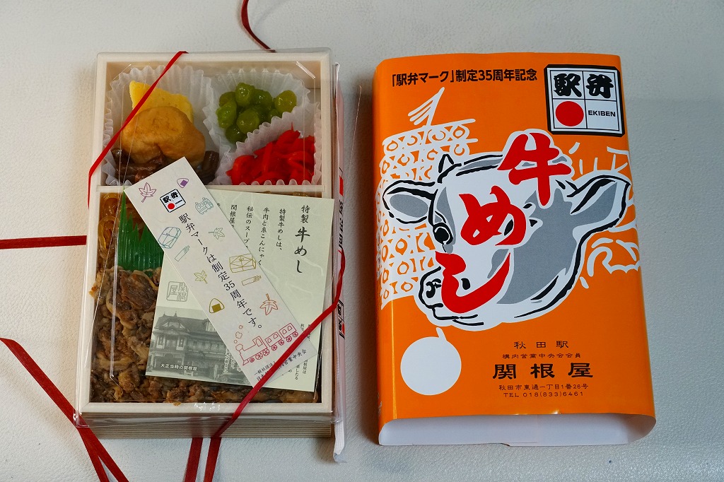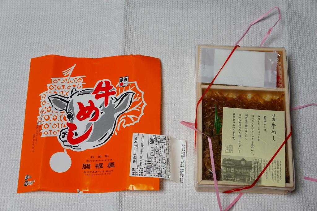 2017(平成29)年12月までに発売か。駅弁の名前は「牛肉弁当(秋田の味)」や「秋田の味牛肉弁当」ともいわれ、掛紙の絵柄にはないが、食品表示ラベルに「秋田の味」という副題が見える。正方形の容器に白飯を詰め、牛肉煮で覆い、タレをかけ、フキ油炒め、揚げかまぼこ、煮豆などを添える。味は甘辛のタレが卓越。フキの油炒めは駅弁では初めて食べたと思う、全体的に普通の牛肉駅弁。赤いふたを読むと秋田駅の駅弁に見えるが、どうもこれは東京都の東京駅や上野駅でしか買えない模様。現地には以前から下記の「牛めし」がある。2022年に終売か。