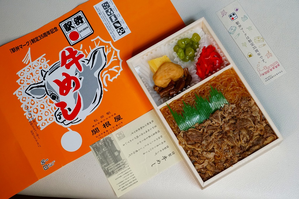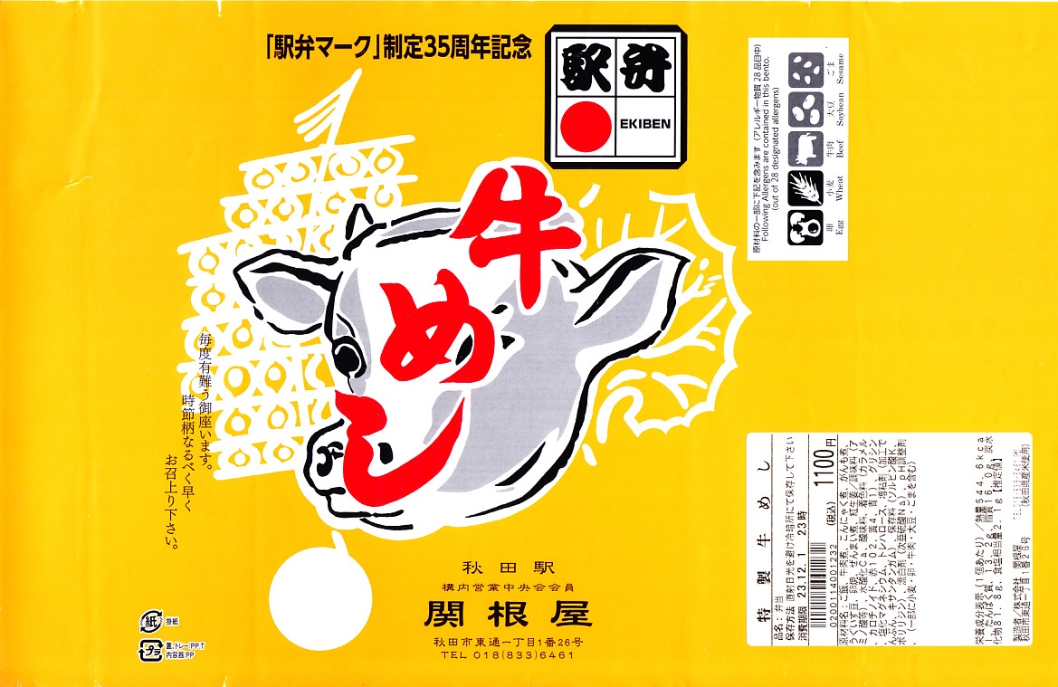 2023(令和5)年12月1日に購入した、秋田駅弁の掛紙。2023(令和5)年11月10日に東京駅で、11日に秋田、大曲、角館、田沢湖の各駅で発売。日本鉄道構内営業中央会の「駅弁マーク」制定35周年を記念し、会員のうち29社が主に11月10日から期間限定で販売した31種類の記念駅弁のうち、秋田駅の駅弁屋のもの。普段の秋田駅弁「特製牛めし」のふたを、36年前の掛け紙デザインを使用したという掛紙に替え、普段の倍くらい大きな駅弁マークを印字した。容器や中身や価格は、通常版と同じ。上記の2014年のものから、付合せががんも煮、うぐいす豆、玉子焼、ぜんまい煮、紅生姜に変わったのは、通常版も同じ。当分の間販売。