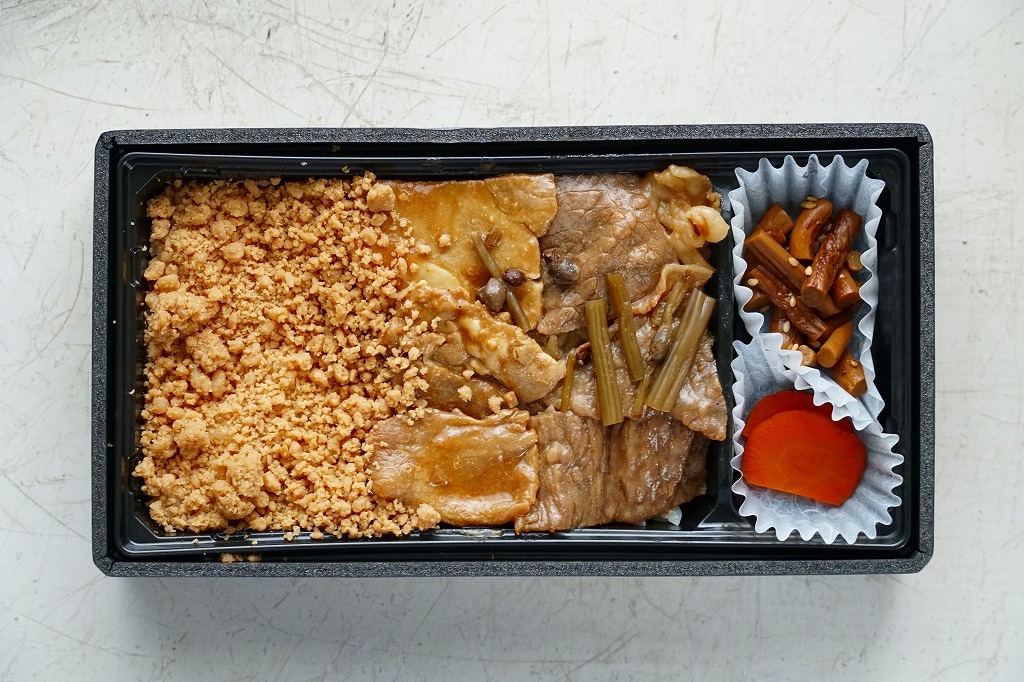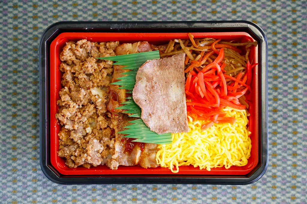 早朝の秋田駅で買えたお弁当。コンビニ弁当のプラ容器に白飯を詰め、大粒の牛そぼろと牛カルビと牛たんと、錦糸卵ときんぴらごぼうと紅生姜で覆って550円。コンビニで売っていたコンビニ弁当ではあるが、JRの子会社の売店で、秋田駅や大館駅の駅弁を売る場所で販売されていて、一応は掛紙もしっかり巻いていたうえ、小柄で安価ながら、味も内容も駅弁並みにしっかりしていた。調製元は「味どうらくの里弁当」と同じところだった。2022年時点でこの調製元の弁当は、秋田駅では売られていない。