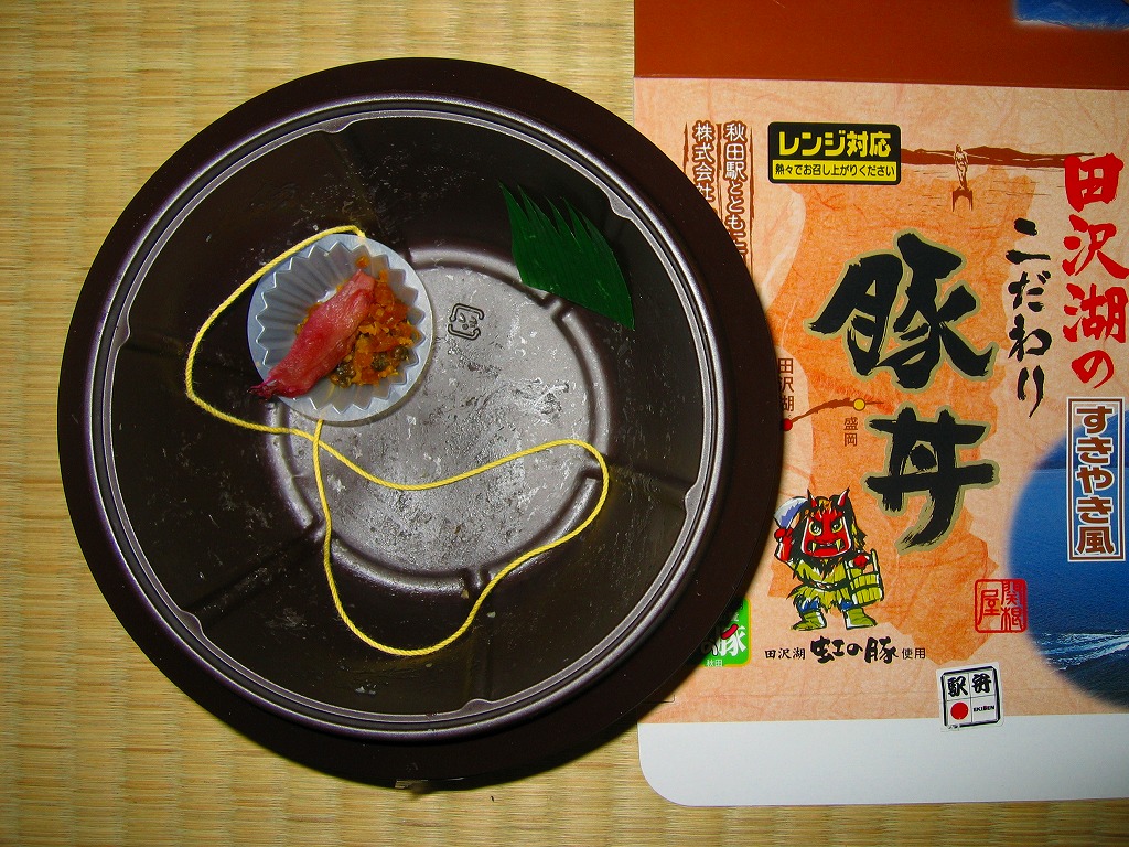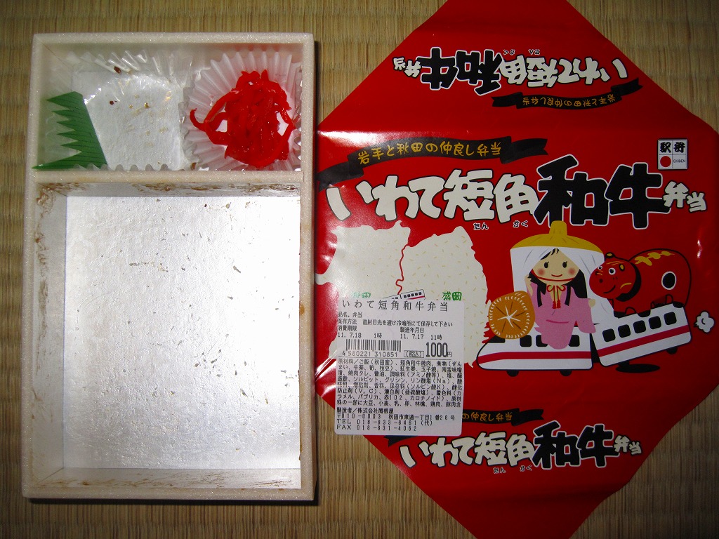 味はうまいのだが、秋田の牛肉駅弁はなぜかいつも肉の分量が寂しく、これもまた然り。そのため、値段の高さが大いに気になった。しかしこの駅弁の目玉はおそらく、萌え系イラストなパッケージなので、大き目の容器でこれを見せ、しっかり話題をつかむことが大切。