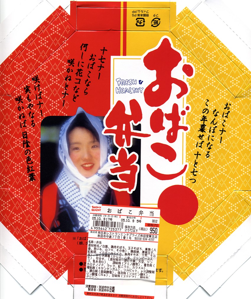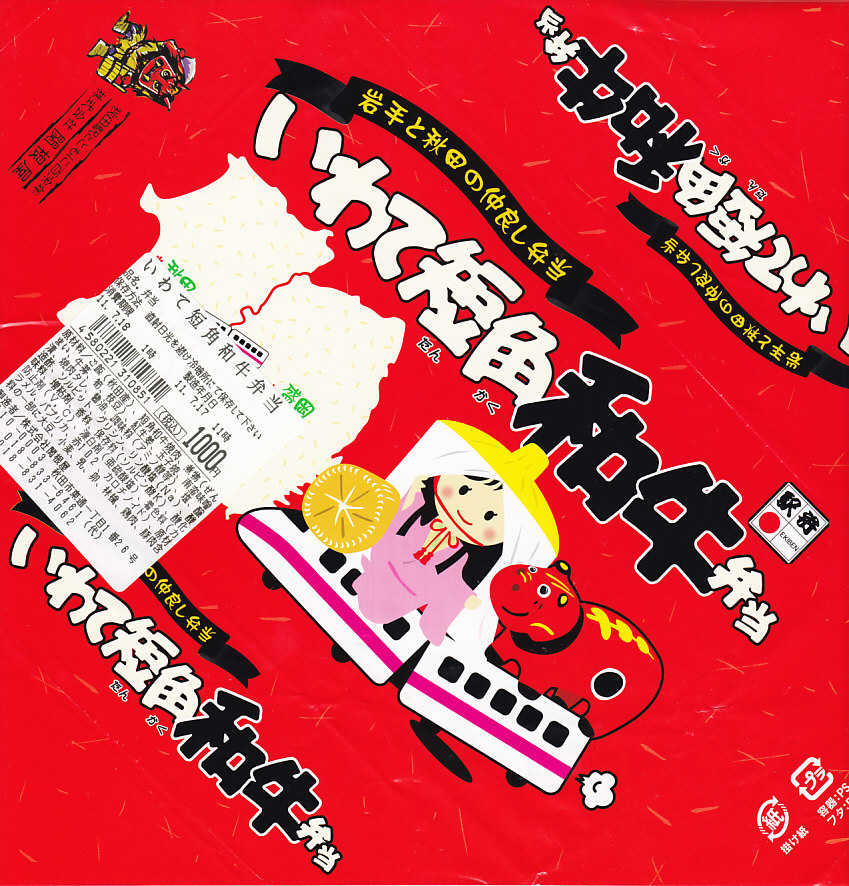 以後も羽後町や農協と西又氏との協力関係によるものか、チラシやポスターやレトルトカレーなどへの展開が始まり、こうやって秋田駅の駅弁にもやってきた。イラストの内容は同町にちなんでおり、ここでは西馬音内(にしもない)盆踊りと小野小町の美少女、そして特産のコメを描き表したという。ただ、この駅弁は半年ほどで売り止めてしまったようで、これはもったいない。