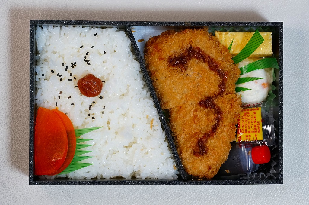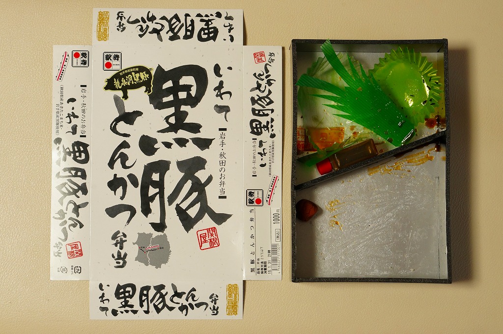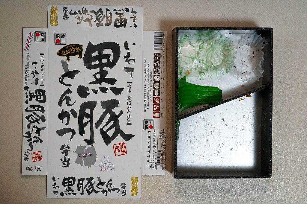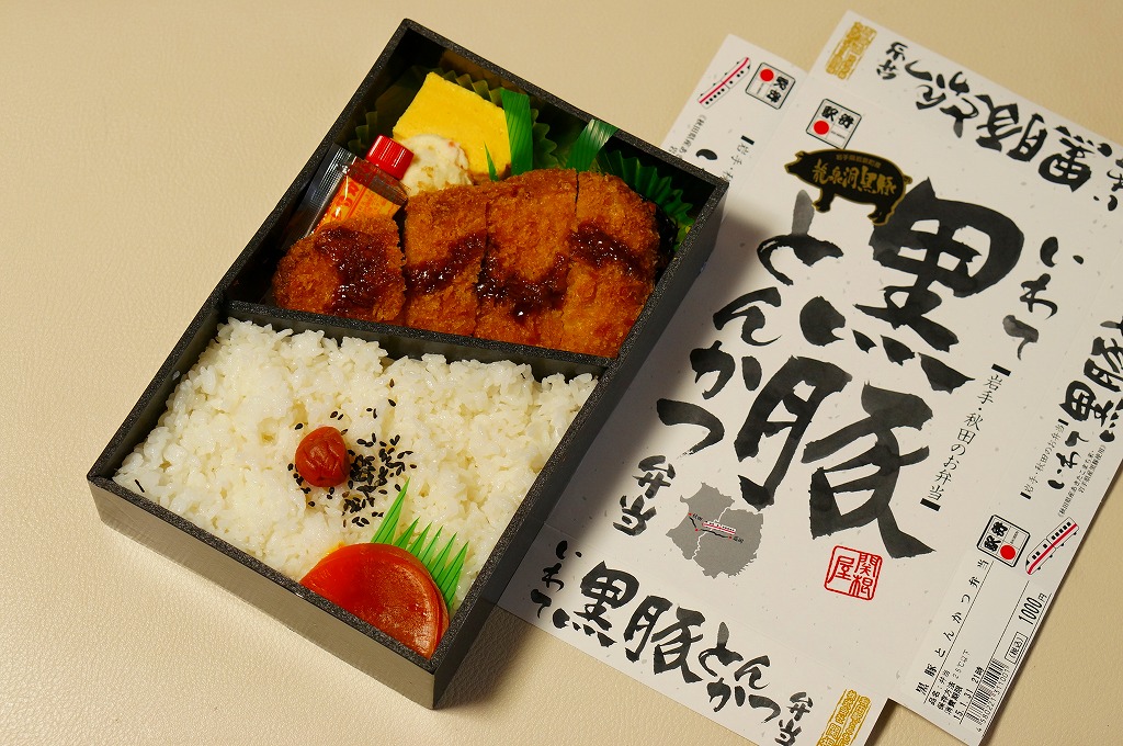 上記の駅弁「いわて黒豚とんかつ弁当」の、2015(平成27)年時点での姿。10年経つのに、まったく変わらない。このように秋田で「いわて」が定着している。