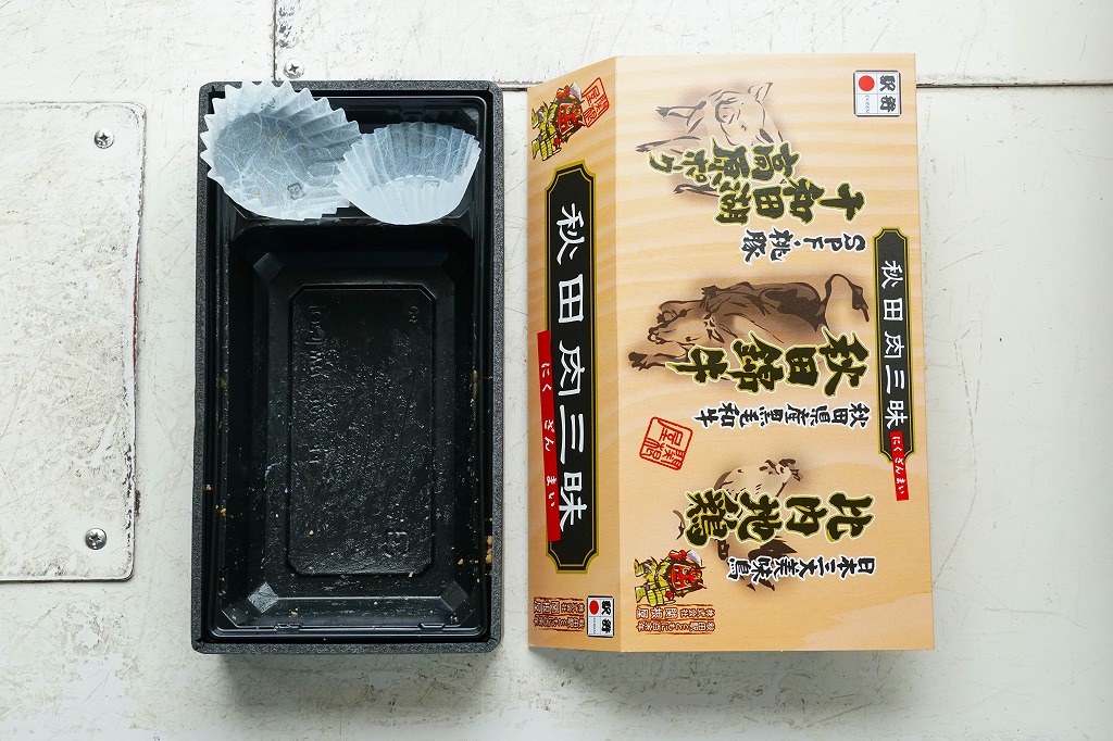 2009(平成21)年の秋までに発売か。その前年の2008年10月に、東京駅で2日間限りのイベント向け駅弁として販売した「秋田肉三昧・大盛」の好評を受け、分量を通常の適量サイズに変更して再度発売したのだという。長方形の容器を収めたスリーブには、豚や牛や鶏のイラストとともに「十和田湖高原ポーク」「秋田錦牛」「比内地鶏」と力強く記され、その底面では写真と文章で大正時代の調製元を紹介する。