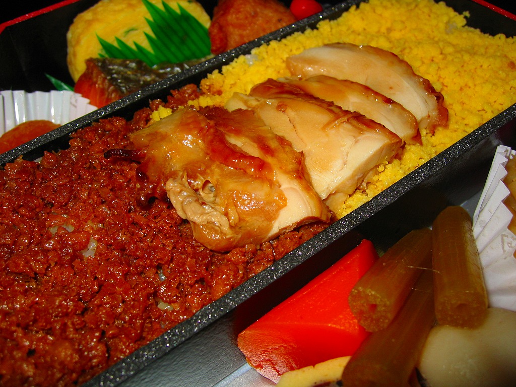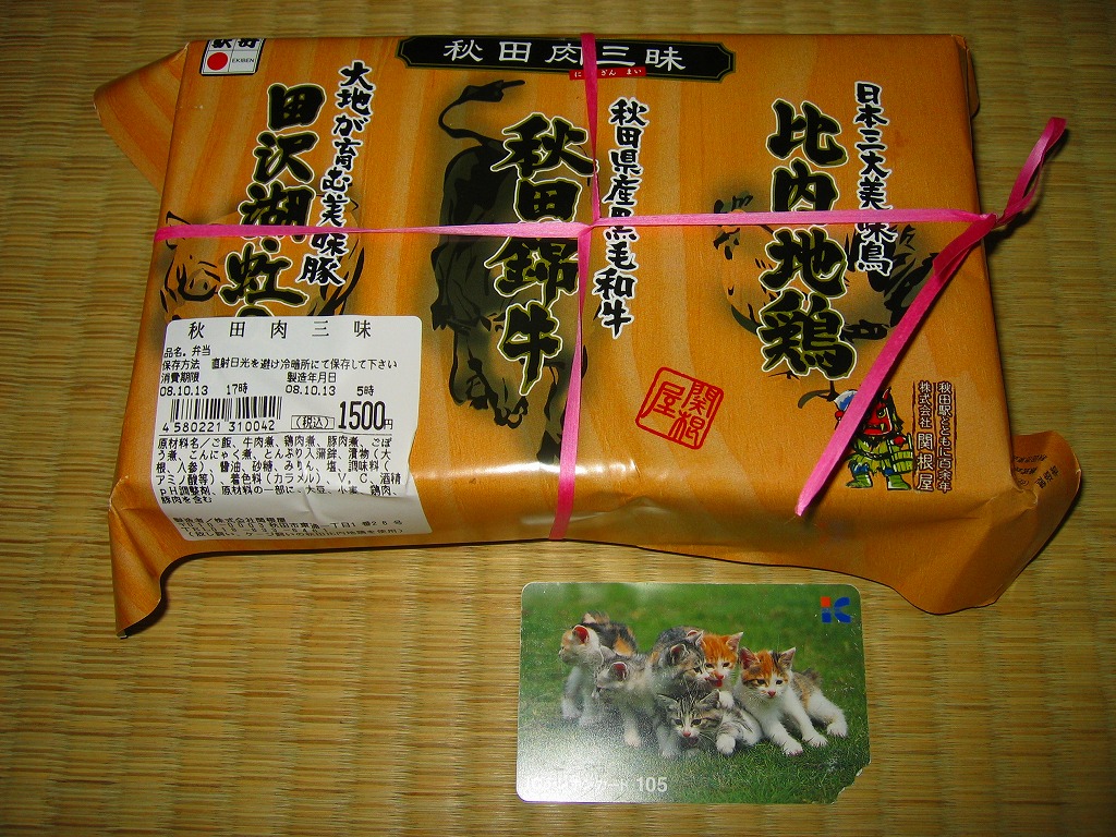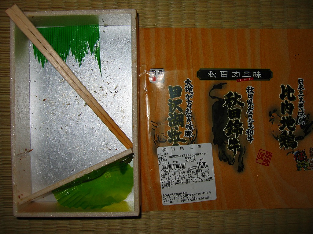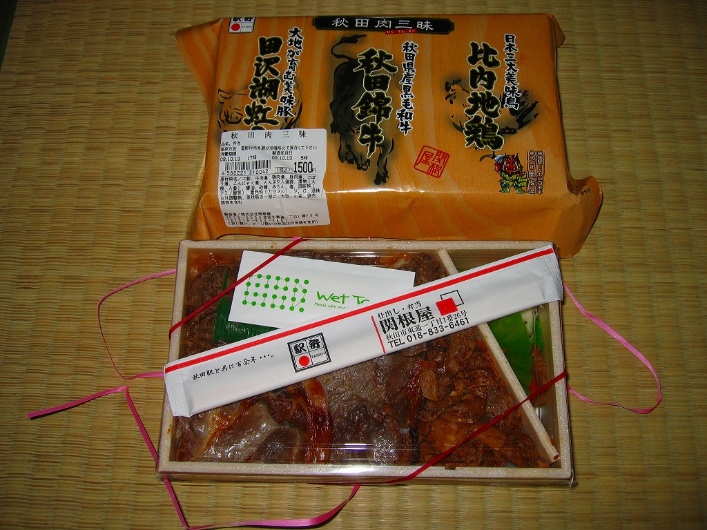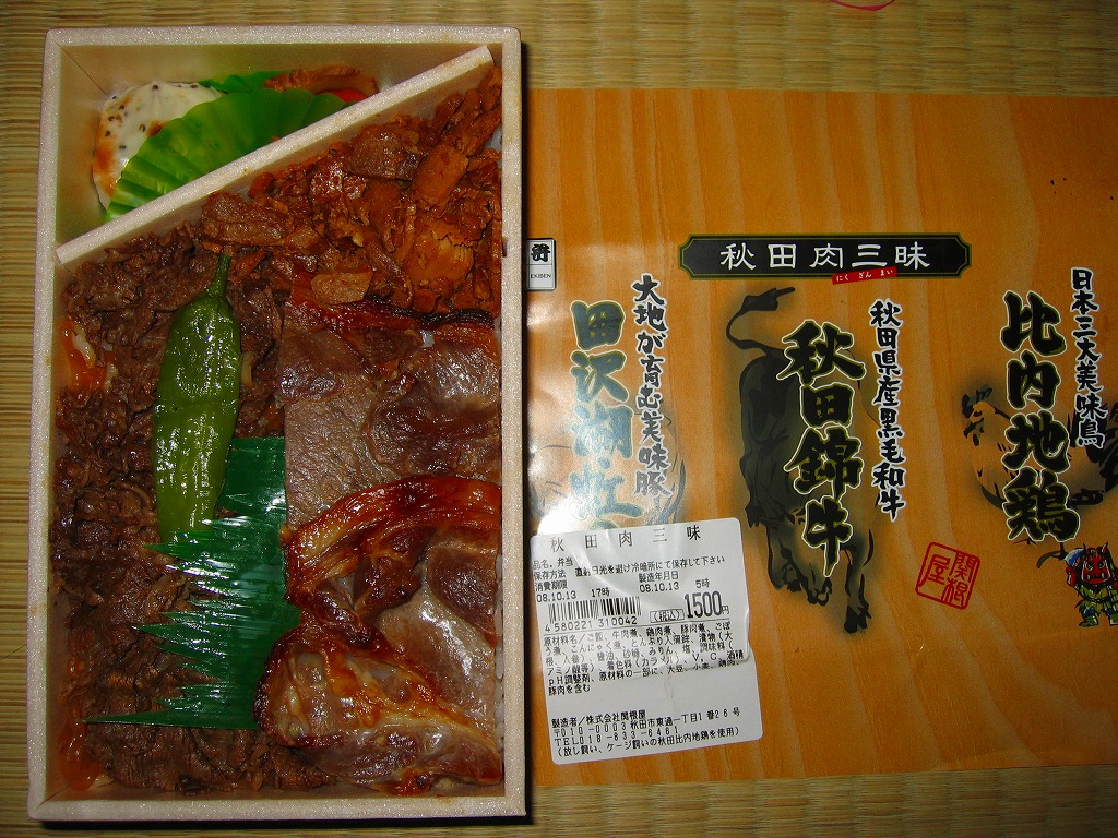 2008(平成20)年10月12・13日の両日に東京駅構内で開催された「東日本縦断駅弁大会−秋−」で販売されたお弁当で、全8種が誕生した「メガ駅弁」のひとつ。長方形の容器に透明なふたをかけて、商品名と肉の名前にそのイラストを書いた掛紙で包み、ひもで十字にしばる。中身は白御飯に上に田沢湖紅の豚のスライスと、秋田錦牛のすき焼きと、比内地鶏のフレークが、それぞれ色濃く煮られて敷き詰められるもの。味付けが似ているから、肉を混ぜても混ざっても、風味に違和感はなかった。