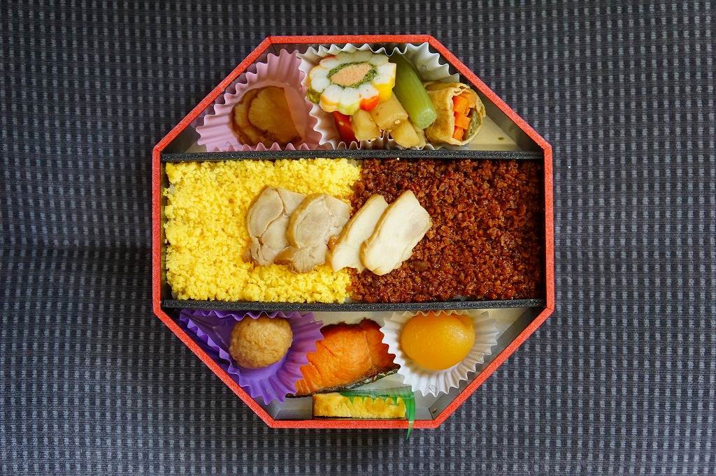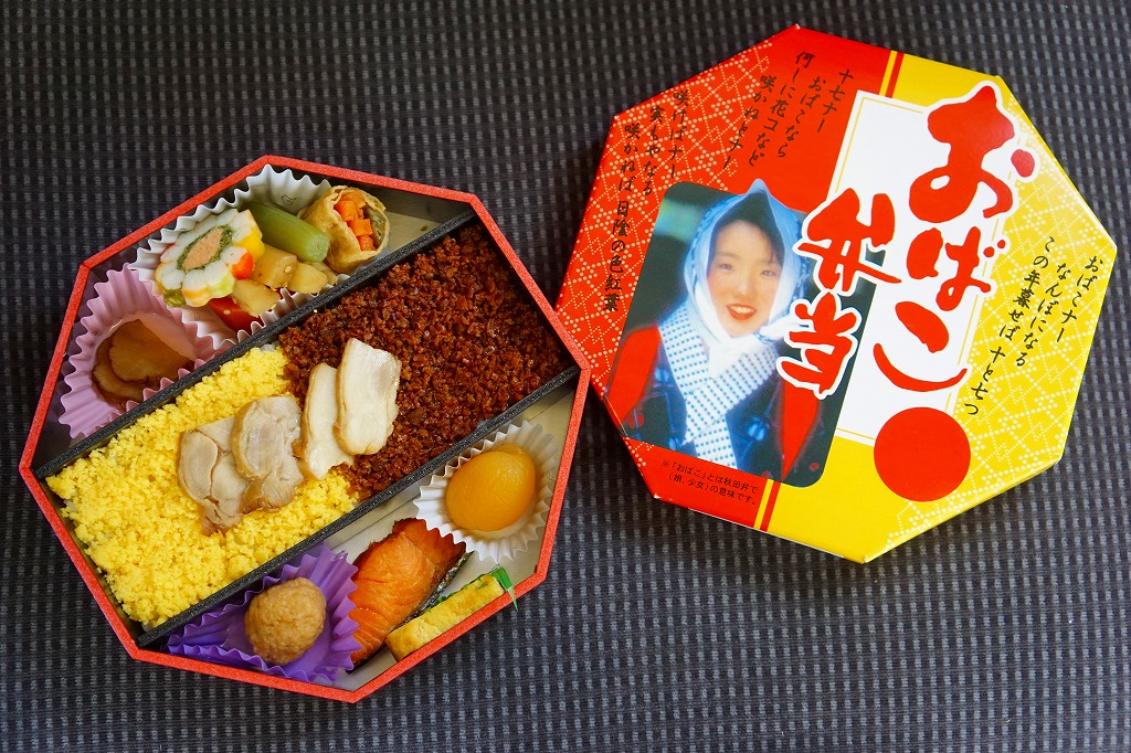 「おばこ」とは秋田弁で少女という意味。秋田美人の写真がふたを飾る。その正八角形のふたを開けると、平行な対角線で3分割された真ん中に、鶏照焼・鶏そぼろ・錦糸卵が載るとりめし、その上下に焼鮭、肉団子、玉子焼、煮物や漬物などを配置する。おばこ弁当=「少女弁当」=女性向けと思うと、ボリュームがありすぎる。長い名前の販売元は、つまり以前の日本食堂。同社が2019(平成31)年3月限りで秋田から撤退し、この駅弁もなくなった。