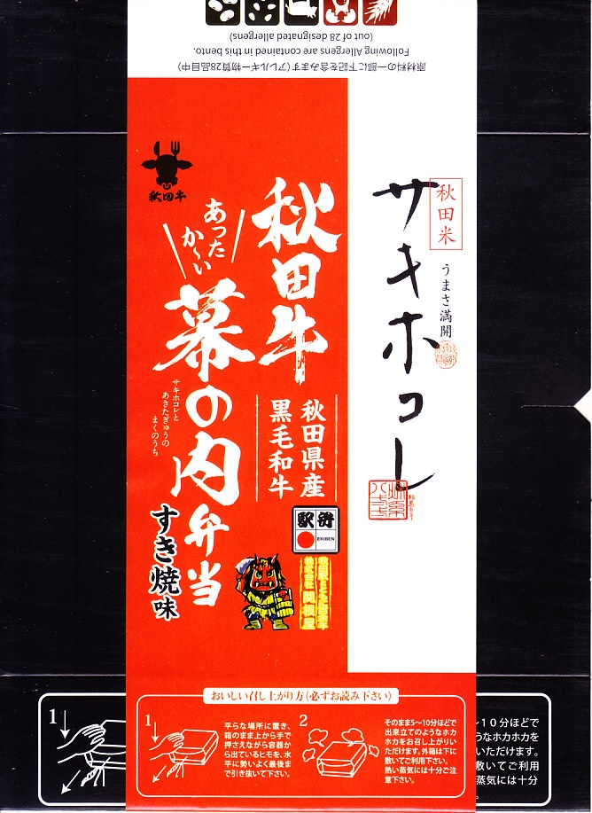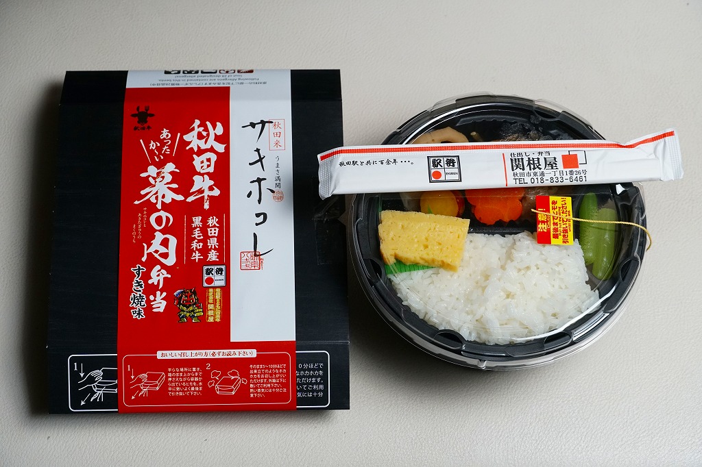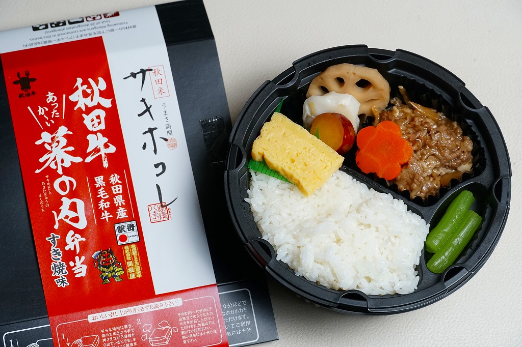 2024(令和6)年12月6日に秋田駅などで発売。JR東日本秋田支社が展開する秋田県冬の大型観光キャンペーン「誰と行く?冬の秋田」に合わせたオリジナル商品として、2025年2月28日までの期間限定で販売。ここでは4月にも買えたので、そのまま売り続けているのだろう。調製元の公式サイトによると商品名は「サキホコレと秋田牛のあったかい幕の内弁当」であるが、その名は現物のどこにも見られない。