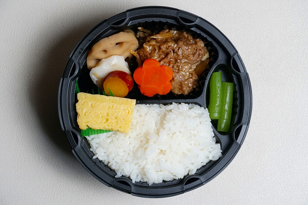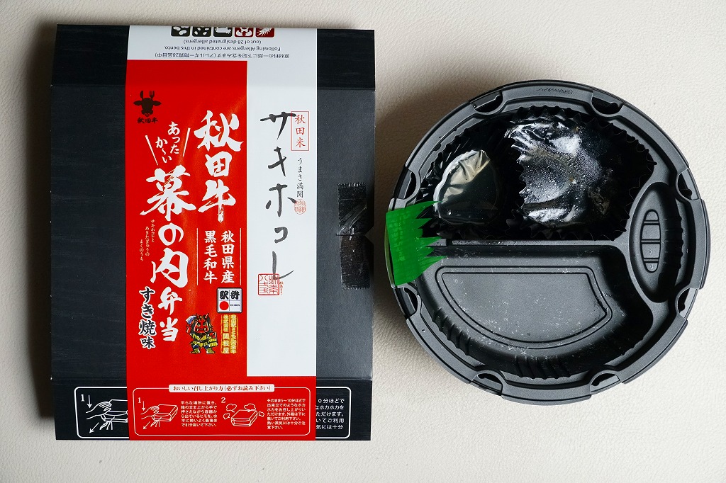 丸い加熱機能付き容器「ナルホット」用の、業務用市販品そのままの黒いスリーブに、商品名などを記した赤い掛紙を巻く。中身は秋田米サキホコレの白飯、秋田県産黒毛和牛とたけのことごぼうの煮物、玉子焼き、ふき煮、れんこん、いぶり大根漬入りかまぼこ、さつまいも甘露煮。お肉控えめの牛肉弁当で、見た目も味でも御飯が主役。