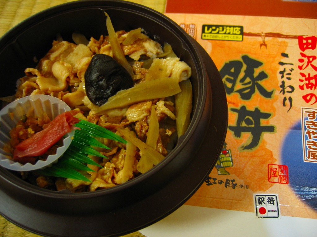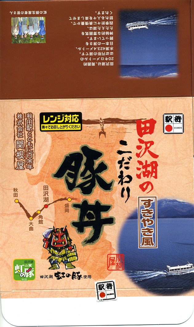 秋冬の駅弁大会シーズンに向けた、2009(平成21)年秋の新商品か。電子レンジ対応のプラ製釜型容器を、駅弁の名前や田沢湖の写真を載せたボール紙の箱に詰める。中身は白御飯の上に「紅の豚」の名が付いた豚肉の少々厚い薄切りを煮たものを、ささがきごぼうと混ぜて載せて、シイタケとミョウガなどを添えるもの。