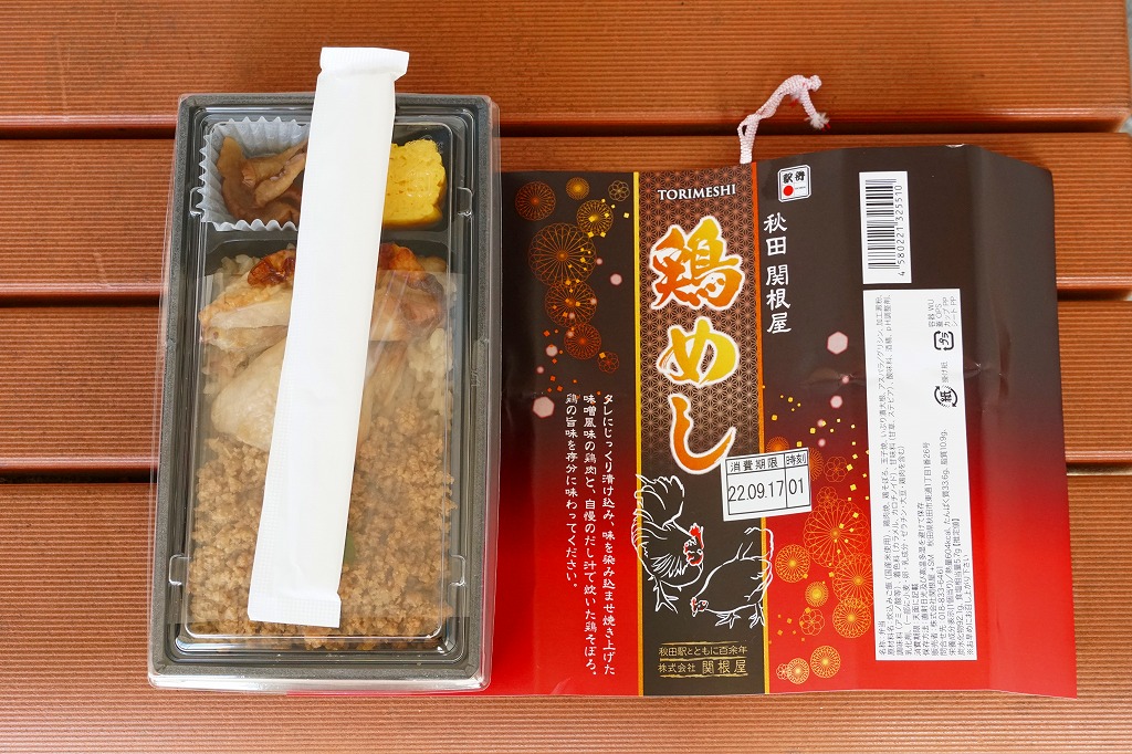 おそらく2022(令和4)年1月の発売で、京王百貨店や阪神百貨店の駅弁大会で輸送販売。今まで「比内地鶏」の名を付けてきた秋田駅の関根屋の鶏飯駅弁で、これを名乗らないシンプルな名前の「鶏めし」が出てきた。長方形の容器に炊込みご飯を詰め、掛紙によるとタレにじっくり漬け込み味を染み込ませ焼き上げた味噌風味の鶏肉と、自慢のだし汁で炊いた鶏そぼろで覆い、アスパラ片で彩り、玉子焼といぶり漬大根を添える。