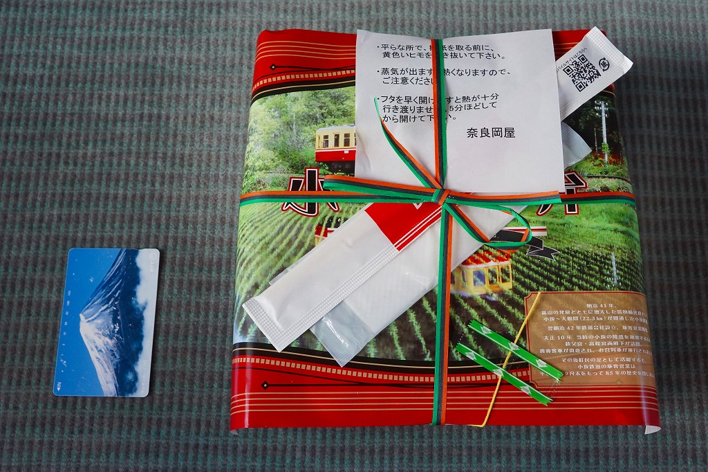上記の「小坂駅弁」の、大きいほう。駅弁では見たことがないサイズの、大きな円形の加熱機能付き容器を使い、中身は「小」と同じ。掛紙の表面は「小」と違い、小坂鉄道の旅客列車の写真を掲載した。こちらも購入には事前の予約が必要だった。