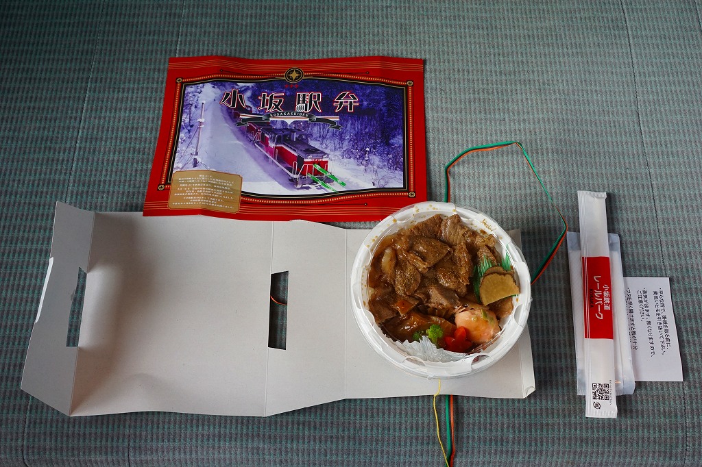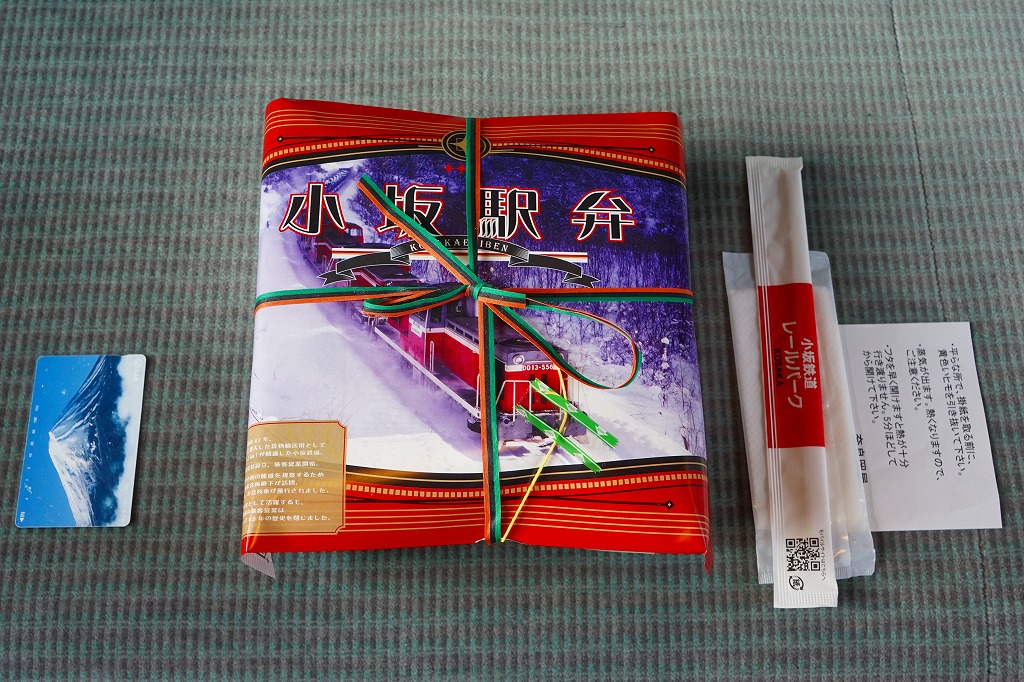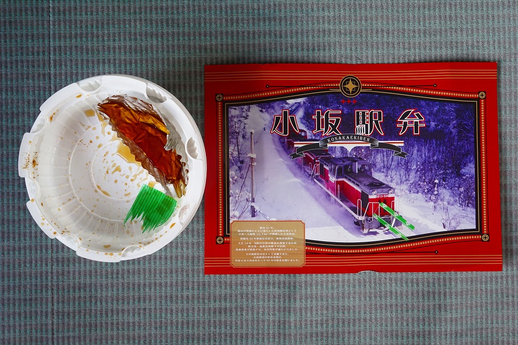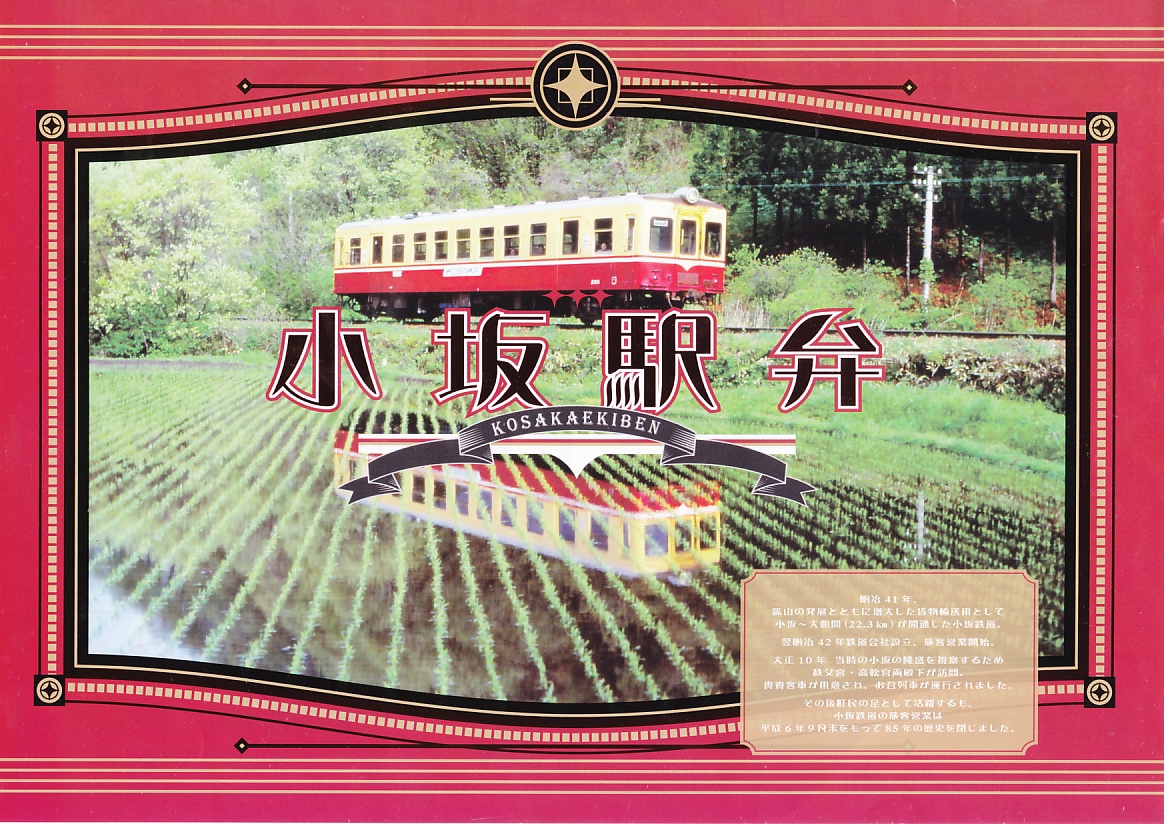 掛紙の表面には小坂鉄道の貨物列車の写真を、裏面には小坂市街の観光地図を載せる。この鉱山町には1909(明治42)年5月に鉄道が通じ、1994(平成6)年9月まで大館駅までの旅客列車が走り、2008(平成20)年3月まで貨物列車が走っていた。その駅の跡地で2014(平成26)年6月に、観光施設「小坂鉄道レールパーク」がオープン、かつての駅舎や線路や車庫や車両を展示し、こんな「駅弁」も売るようになった。