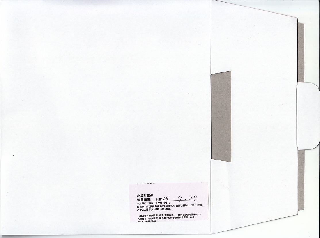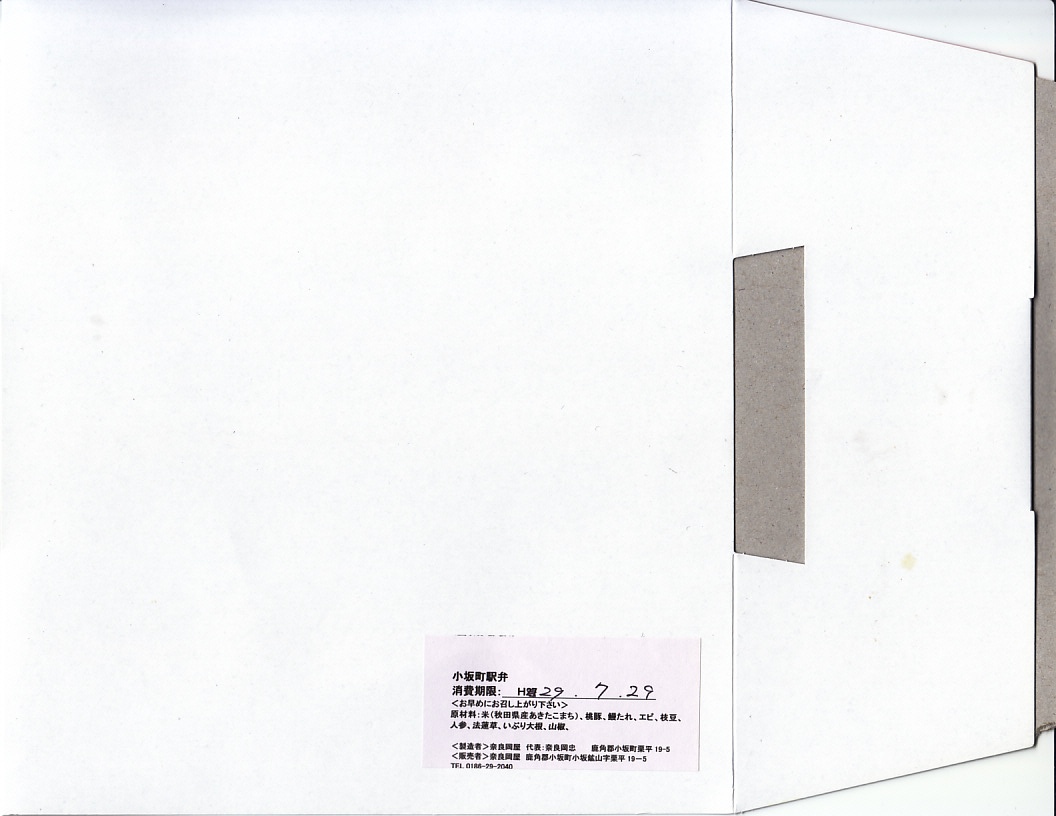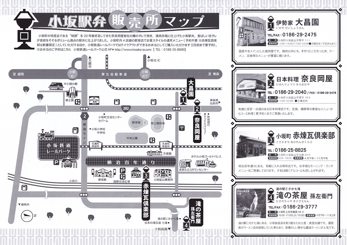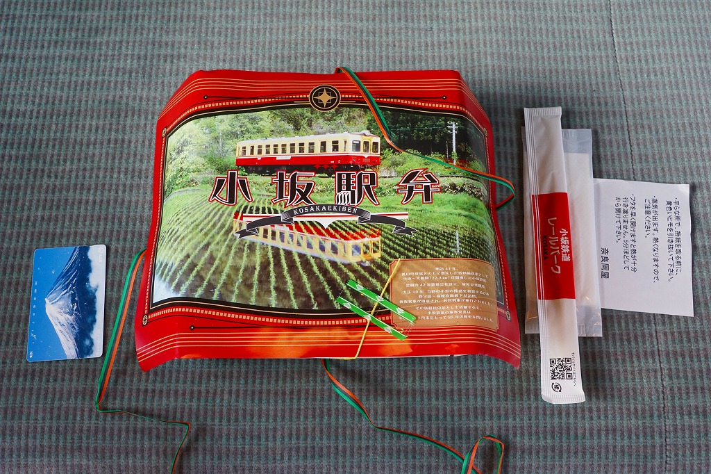 掛紙の表面には小坂鉄道の貨物列車の写真を、裏面には小坂市街の観光地図を載せる。この鉱山町には1909(明治42)年5月に鉄道が通じ、1994(平成6)年9月まで大館駅までの旅客列車が走り、2008(平成20)年3月まで貨物列車が走っていた。その駅の跡地で2014(平成26)年6月に、観光施設「小坂鉄道レールパーク」がオープン、かつての駅舎や線路や車庫や車両を展示し、こんな「駅弁」も売るようになった。