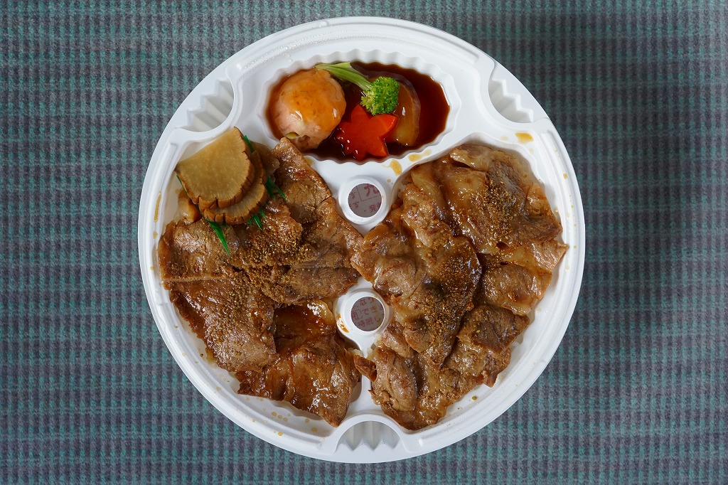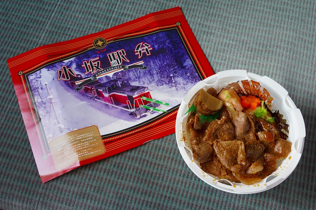 2015(平成27)年1月9日に小坂駅で発売。発売当時は1,000円で、今回の予約購入時には「大」1,200円と「小」800円の2種類があった。こちらは「小」で、仙台駅などの駅弁でおなじみの加熱機能付き容器に、御飯を詰め、豚焼肉で覆い、エビ、枝豆、にんじん、ほうれんそう、いぶり大根を添える。分量は全然「小」でない、肉でなくタレに臭みのある、薄くてざらっとした、たっぷりの豚焼肉丼。