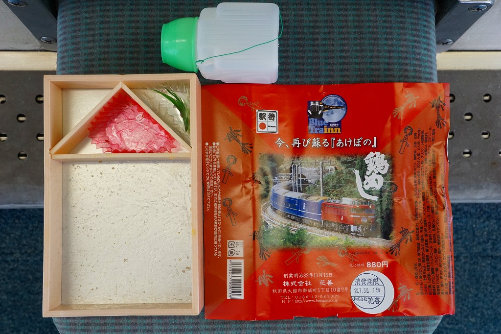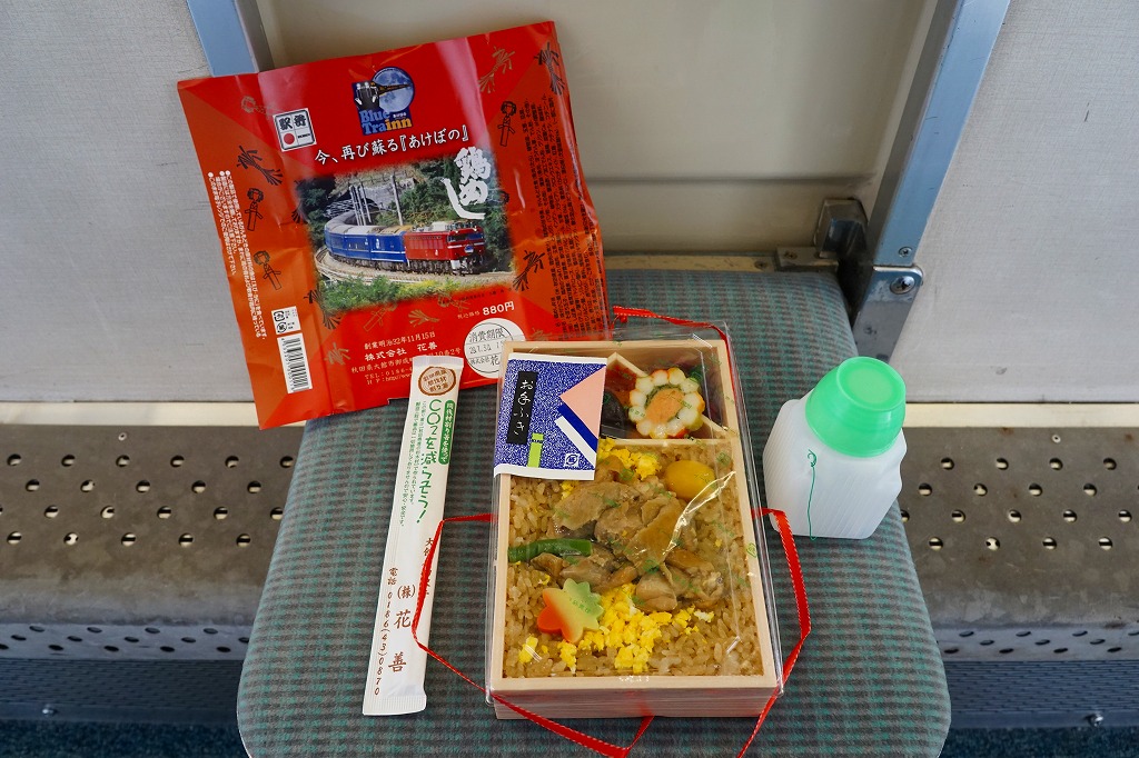 小坂駅跡地の小坂鉄道レールパークの簡易宿泊施設「ブルートレインあけぼの」で、宿泊者に限り事前予約で朝食に購入できるお弁当。中身は大館駅の名物駅弁「鶏めし」と同じ。掛紙が特別版で、宿泊施設のロゴマークに、寝台特急あけぼの号の走行写真が載る。掛紙に「税込価格880円」とあるが、常にポリ容器のお茶(120円)とセットで1,000円にて販売される模様。ポリ容器のお茶のみを買うことはできた。