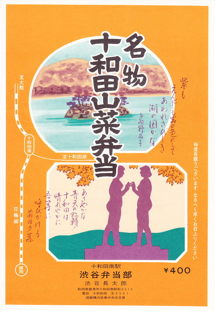 1980年代に使われたのではないかと思われる、昔の十和田南駅弁の掛紙。調製元は渋谷弁当部。十和田湖と乙女の像と、与謝野晶子と前田夕暮の詩を描く。