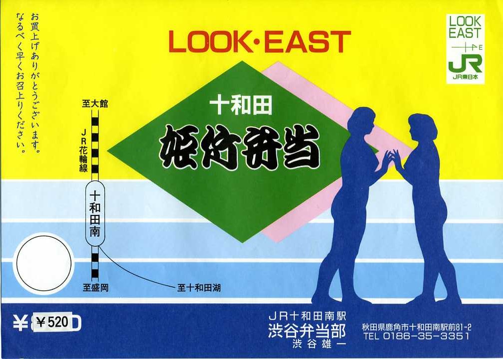 1990年代頃に使われていたと思われる、昔の十和田南駅弁の掛紙。JR東日本の観光キャンペーン「LOOK EAST」のオリジナル駅弁131種類のひとつとして、1989(平成元)年3月に発売か。有名な十和田湖畔の乙女の像をシルエットで描くほかに、旅情や郷愁あるいは購入意欲を持ちにくいデザインではあるが、バブルの頃なので仕方がないか。800円の価格をシールで520円に訂正している。「LOOK EAST」とは、1988年4月からおそらく1992年5月頃までJR東日本が使っていた観光キャンペーンの愛称。