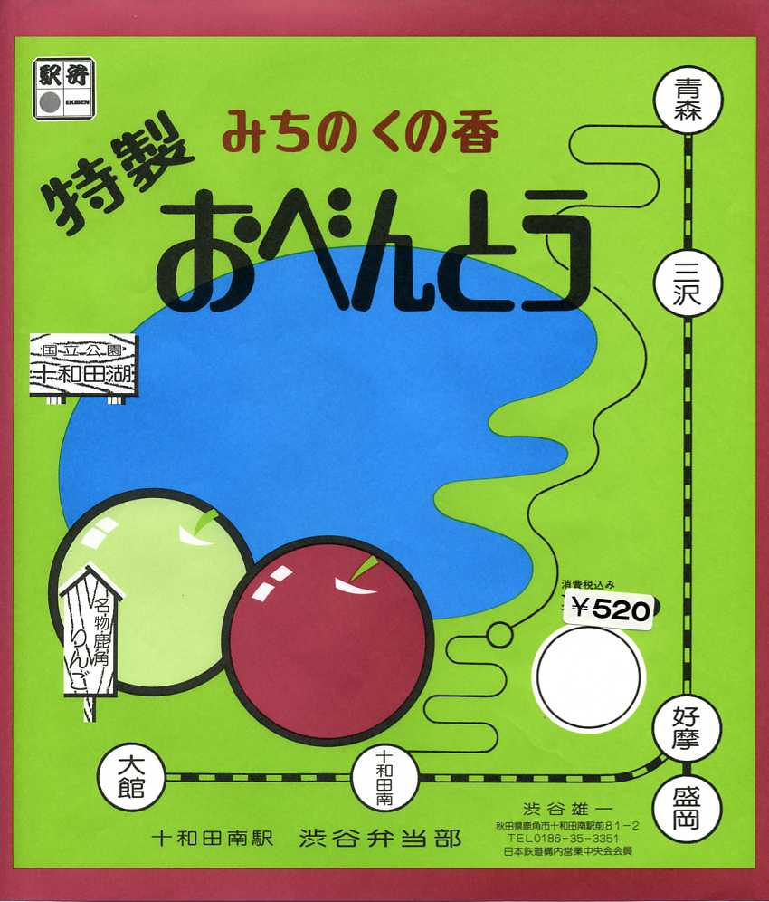 1995年代頃に使われていたと思われる、昔の十和田南駅弁の掛紙。税込み価格を改めて訂正するところから、1997年4月の消費税率改定以降のものか。この頃になると十和田南駅から十和田湖へアクセスする観光客もほぼいなくなり、駅弁の存在も幻になりかけていた頃だと思われる。