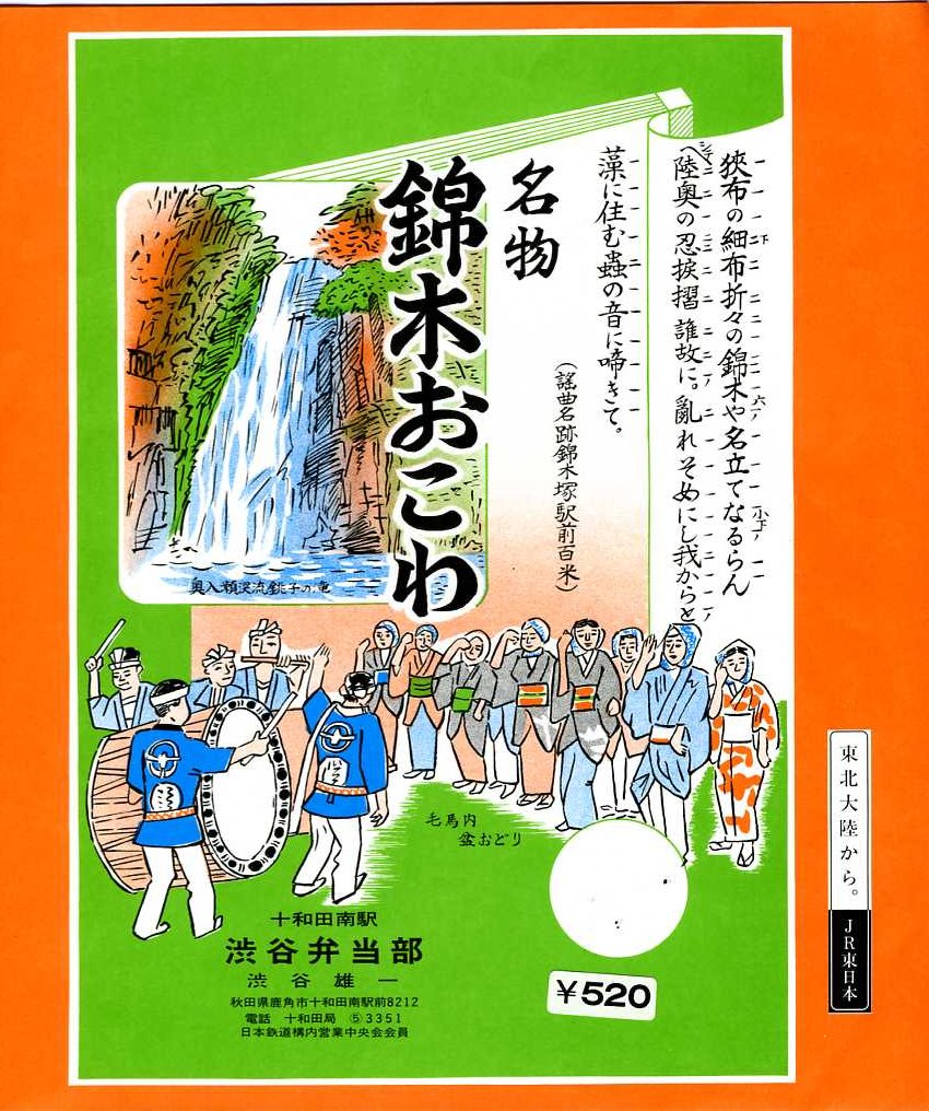 1995年代頃に使われていたと思われる、昔の十和田南駅弁の掛紙。奥入瀬渓流銚子の滝とともに毛馬内盆おどりが描かれる。毛馬内といえば十和田南駅の旧称。もはやここからバスで十和田湖へ行くことはできないのだから、駅名も元に戻したほうが良いと思う。「東北大陸から」とは、1995年6月からおそらく1998年3月頃までJR東日本が使っていた観光キャンペーンの愛称。