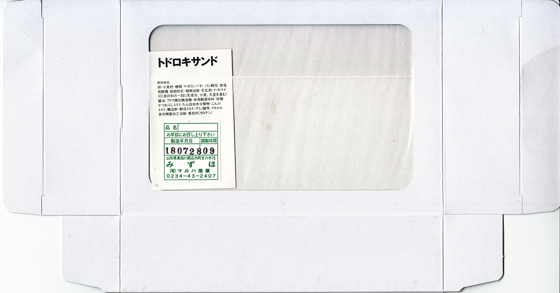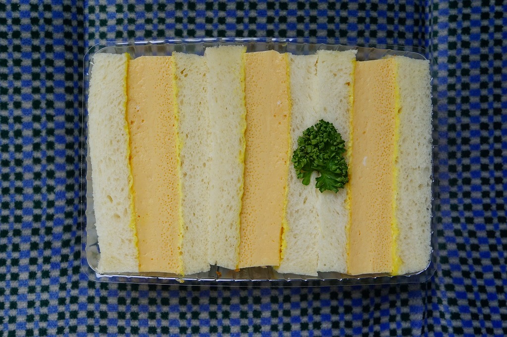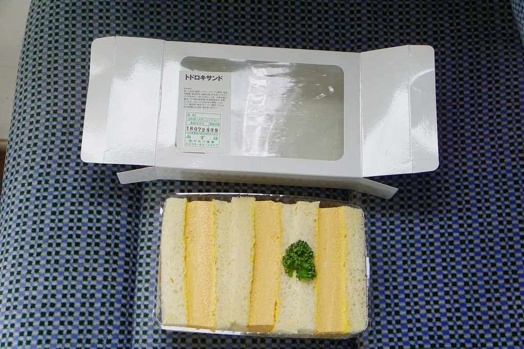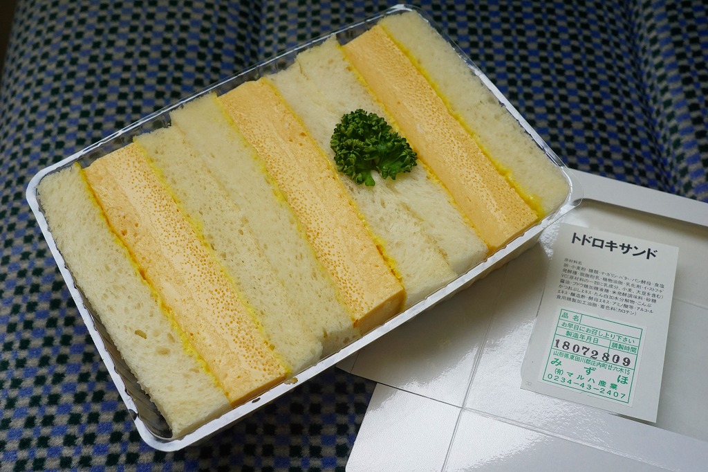 余目駅で買えた、箱入りサンドイッチ。駅舎に入居した喫茶と売店の機能を持つ店舗「あまるめホッとホーム」で売られていた。商品そのものは2017(平成29)年の年末までに駅前で発売か。大阪や東京から近年は全国に流行中のタマゴサンド、玉子焼サンドの、やや辛子が多めなものが3切れ、透明のトレーに詰めて白い紙箱に収まっていた。2025年の訪問時、店舗は駅舎から退出し、少し先の建物へ移転していた。この商品が現存するかは不詳。