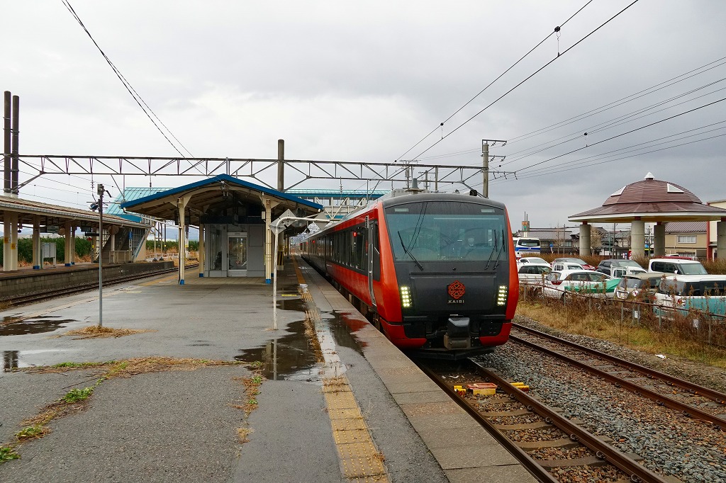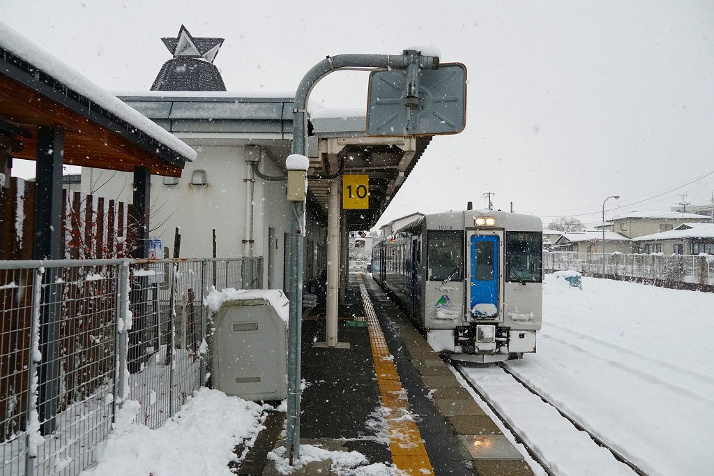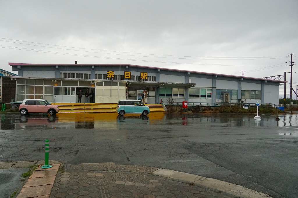酒田駅からも鶴岡駅からも普通列車で20分弱。庄内町は山形県の日本海側の庄内地方で鶴岡と酒田に挟まれた、人口約2万人の町。この羽越本線が陸羽西線を分ける駅は、かつては公式な駅弁販売駅として、1930年代から1970年代まで酒田駅とも鶴岡駅とも異なる駅弁が売られた。1914(大正3)年9月20日開業、山形県東田川郡庄内町余目。
