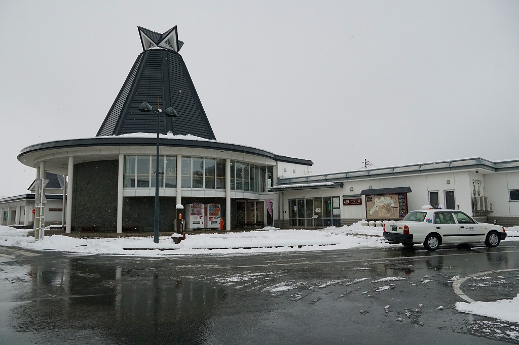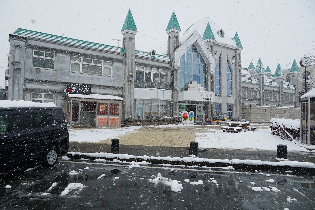 山形駅からJR左沢線の列車で約40分。大江町は山形県の中央で山形盆地の西部に位置する、人口約7千人の町。最上川のゆるやかな流れが尽きる位置にある河港として、物流や商業で栄えた。駅弁は昔も今もないが、2024年から駅前でイベントがあると米沢駅の駅弁屋の「大江地鶏弁当」が売られる。1922(大正11)年4月23日開業、山形県西村山郡大江町大字左沢字前田。