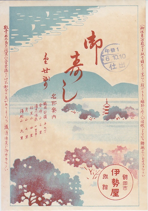1931(昭和6)年10月10日13時の調製と思われる、昔の鶴岡駅弁の掛紙。調製印に「仕出」とあるのは珍しいと思う。この風景は名所案内にあるとおり、出羽三山まで描いたイメージか。