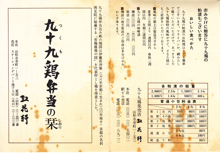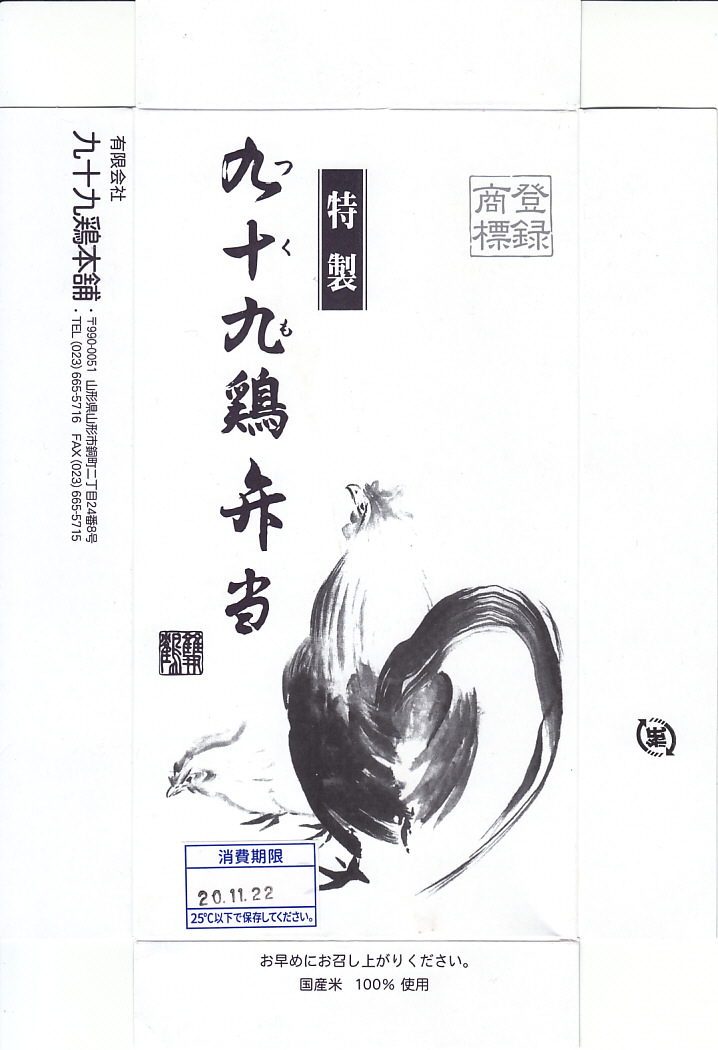 昭和40年代、1970年前後の、不明月21日6時の調製と思われる、昔の山形駅弁の掛紙。九十九鶏弁当は山形駅の名物駅弁で、山形で愛された弁当であった。当時の山形駅の駅弁屋であった紅花軒(こうかけん)が駅から撤退し、その現況がよくわからなくなった今も、上記のとおり復刻品が販売される。