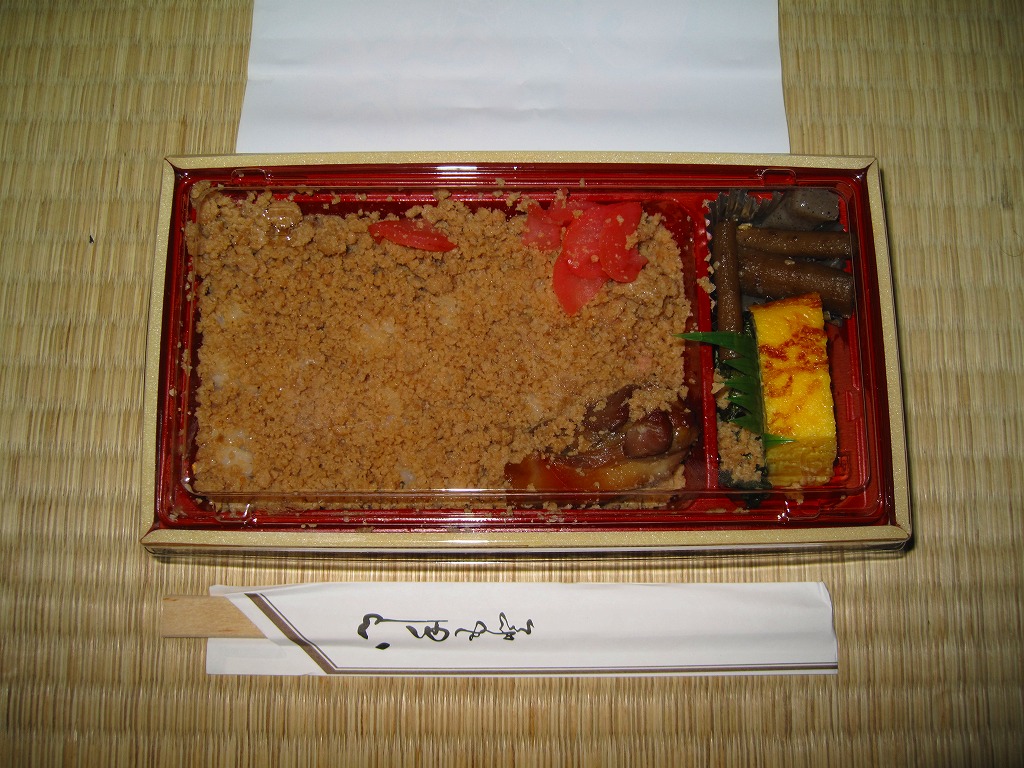 細長い長方形の容器に、古風に鶏とヒヨコを描くボール紙のふたをかける。中身は白御飯の上に鳥そぼろと鳥照焼を載せて鳥唐揚を添える鳥づくしな内容も、鳥そぼろは非常に甘ったるく、鳥照焼は逆にとても塩辛い、味覚が変になりそうな味付け。鳥唐揚は普通の醤油味であった。現存しないと思われる。