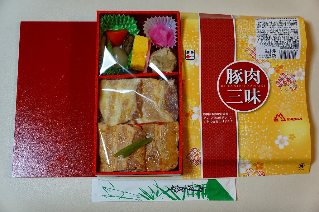 下記の駅弁「豚肉三昧」の姉妹品に見えるので、これもまた2017(平成29)年の夏頃の新作か。「牛肉三昧」という駅弁も出ている。容器が同じ、掛紙のデザインも同じ、おかずもほぼ同じ。東京駅で買ったら「販売者:合同会社もりべん」「製造者:株式会社松川弁当店」というのも同じ。