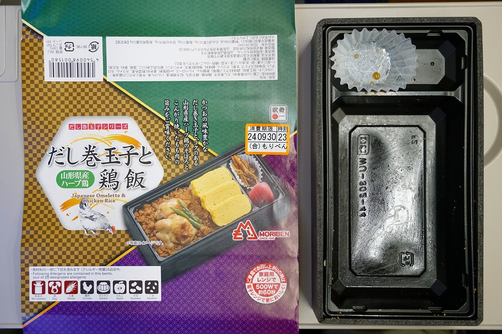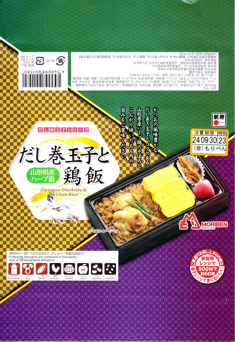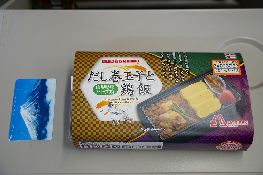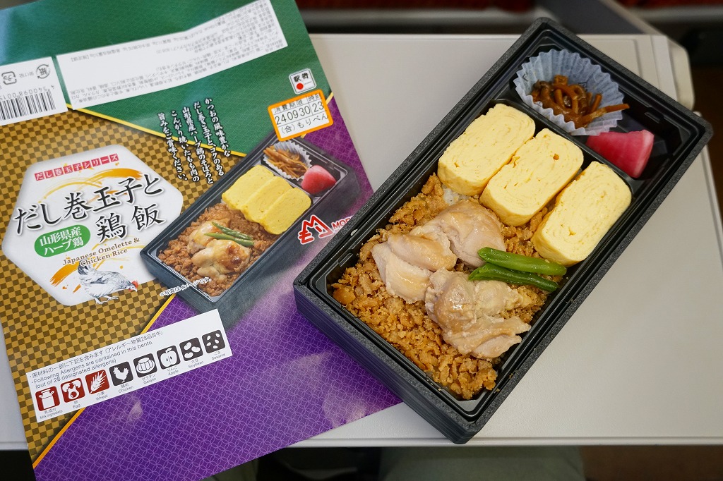 2023(令和5)年末までに発売か。長方形のプラ容器に白飯を詰め、だし巻玉子3枚と山形県産ハーブ鶏のそぼろで覆い、鶏もも肉といんげんを載せ、ごぼうときのこの醤油煮と紅大根酢漬を添える。つまり鶏飯または鶏親子飯。たっぷりのだし巻玉子のおかげで、風味がとても柔らかく感じる。中身の写真と3つの色と模様でできた掛紙を読むと、「だし巻玉子シリーズ」というものができたらしく、他に「だし巻玉子と鮭はらこ飯」と「だし巻玉子と山形牛しぐれ煮弁当」がある模様。