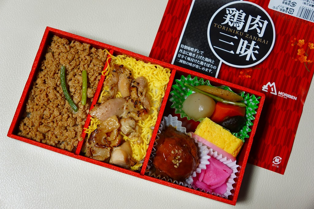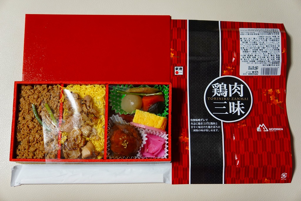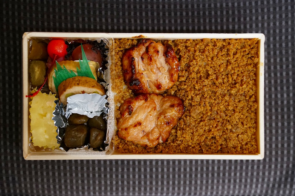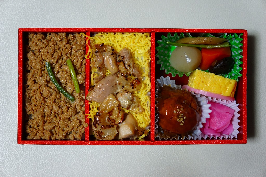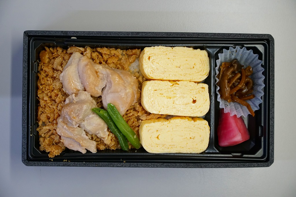 白御飯をとりそぼろと、焼き鳥と錦糸卵でそれぞれ覆い、肉団子、かまぼこ、玉子焼、こんにゃくなどの煮物、大根桜漬を添える。焼き鳥の肉が固い脂肪の塊であったものの、香りの良い鶏駅弁だった。2020年時点で3日前10個以上の予約販売という。2022年に終売か。