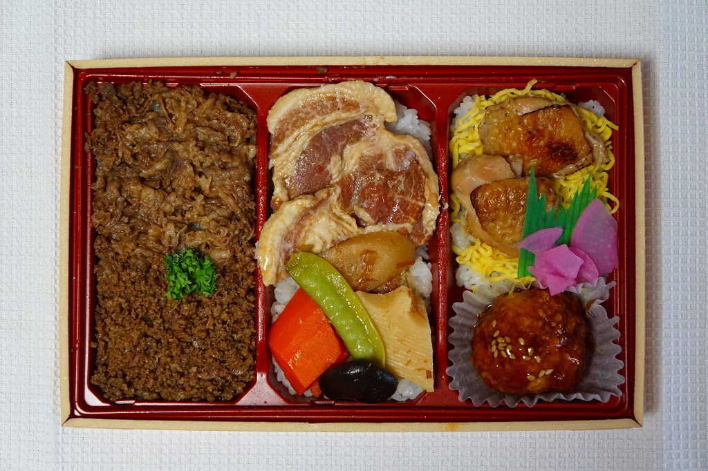 2017(平成29)年の夏頃の新作か。白御飯をしょうゆ味とみそ味の豚焼肉で覆い、肉しゅうまい、かまぼこ、玉子焼、こんにゃくなどの煮物、大根桜漬を添える。過半が脂身の異様な豚肉は、この駅弁の仕様なのだろうか。タレの強い味も借り、臭みや固さはなかった。
