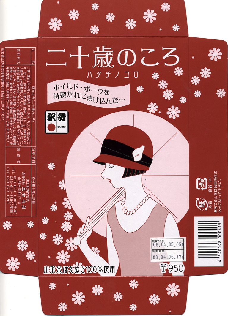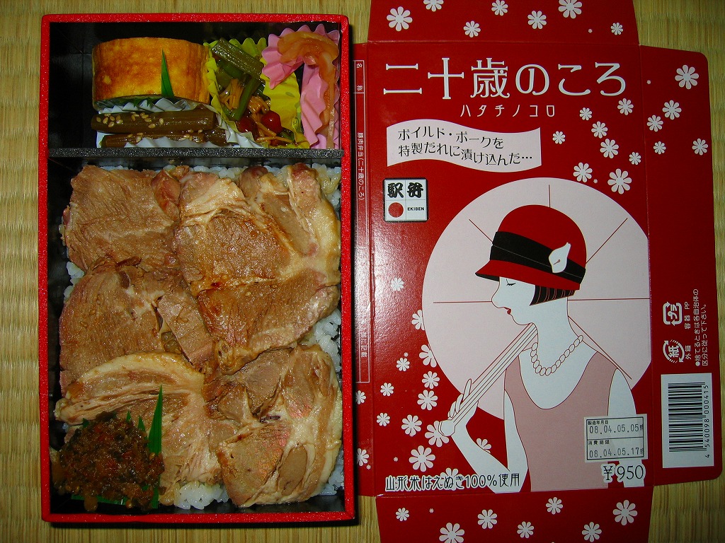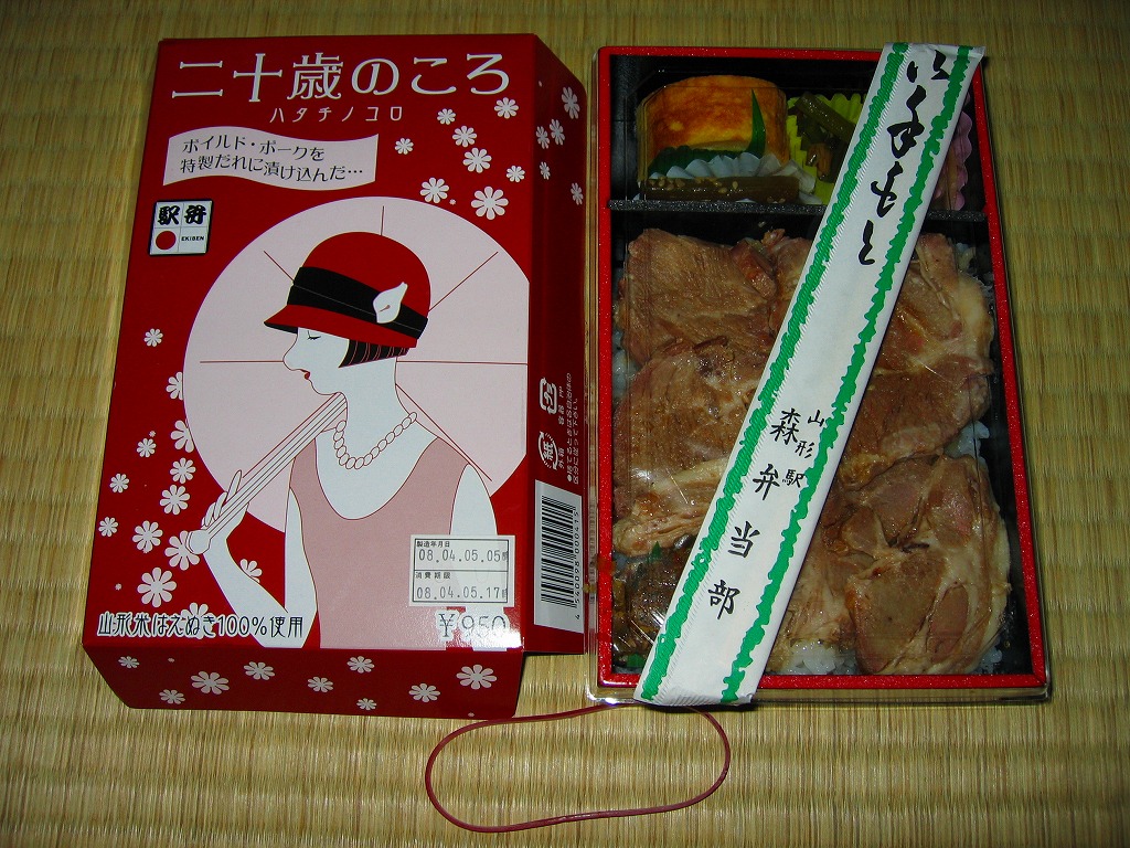 JR20周年の記念駅弁の山形駅版として、2007(平成19)年の秋頃に発売。長方形の容器に透明なふたをして、モダンでレトロな女性が描かれるボール紙でさらにふたをして、輪ゴムでしばる。中身は駅弁の名前からは想像ができないチャーシュー丼。見た目に並で、しかし風味は上品かつ柔らかく、脂も含め分量十分なボイルドポークが、白御飯の上に載る。なるほど20歳の頃はこんな重量級な弁当でもペロリと食べて何ともなかったな、と回想する駅弁に思えた。