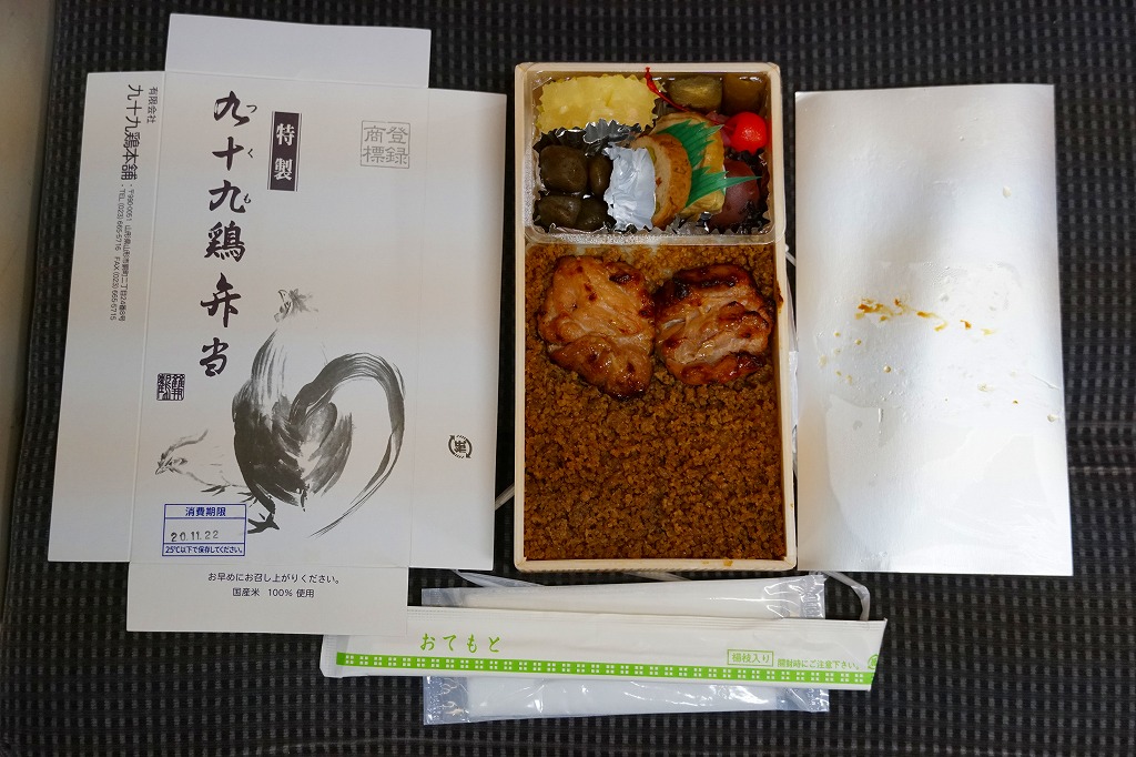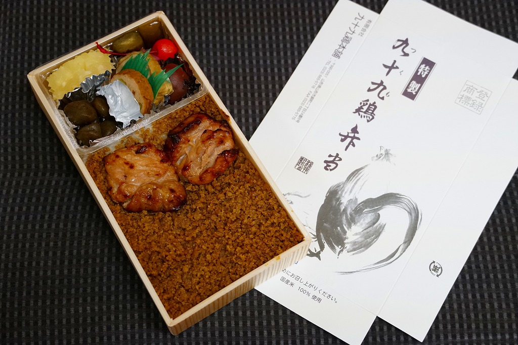 今は山形駅の駅ビルで売られる名物弁当。1966(昭和41)年頃に、当時の山形駅の駅弁屋である紅花軒(こうかけん)が発売、昭和時代の名物駅弁であった九十九鶏弁当の、名前と姿を受け継いだものと考えられる。白飯を鶏そぼろで覆い、鶏照焼2個を置き、鶏肉巻、玉こんにゃく、パイン、3種の漬物、さくらんぼを添える。この姿と味が引き続き、駅と市内で親しまれている模様。なお、紅花軒が駅弁から撤退した後に売られる、かつての山形駅弁の九十九鶏弁当は、もう1系統存在した。