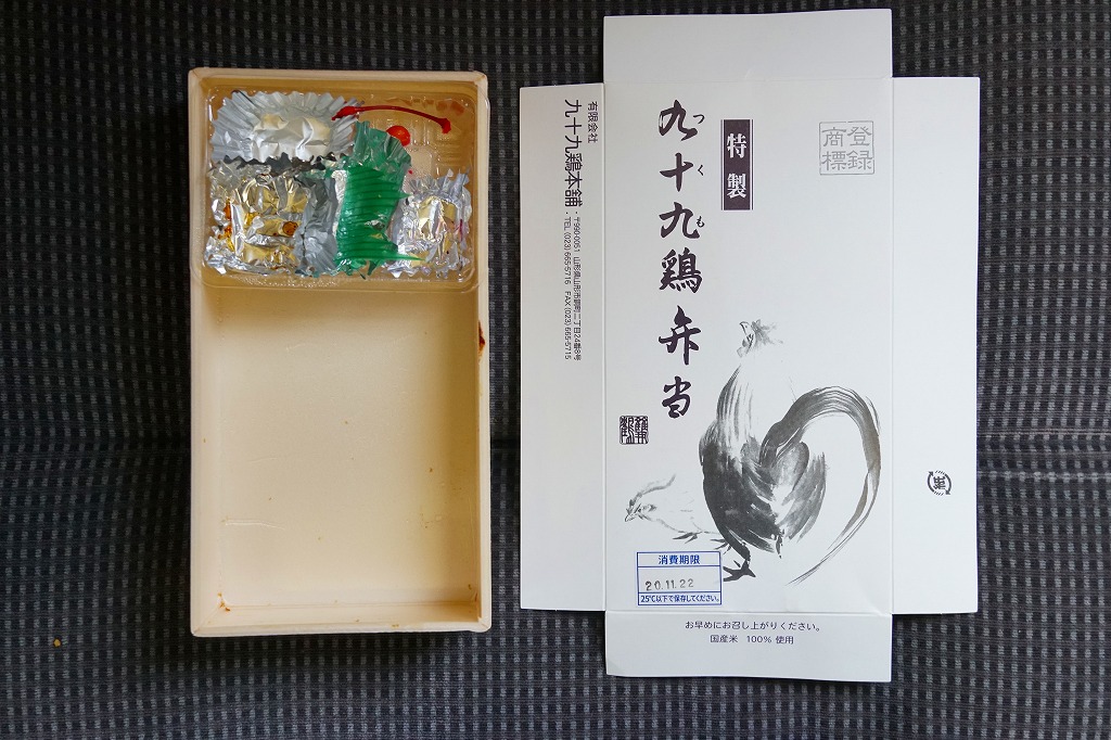 この駅弁は、かつて山形駅の公式駅弁「九十九鶏弁当」が、駅弁屋の駅弁撤退により街弁に変わり、しかし容器や外観や内容をほとんど変えないまま、山形駅ビル1階エスカレーター脇の肉屋さん「吉田精肉店」での販売で生き残っていたもの。以前は山形駅を代表する駅弁とされ、現在も事情通な駅弁ファンは現役の山形駅弁をパスして買いに来るほど。2017年11月の駅ビル改装を前に閉店した模様。