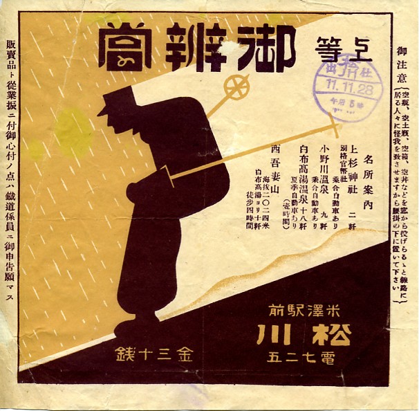 30銭の価格から、1922(大正11)年でなく1936(昭和11)年の11月28日17時の調製と思われる、昔の米沢駅弁の掛紙。軍人がスキーをしているように見える絵柄は、不穏な時代の空気を反映したものか、あるいは日本にスキーを伝えたとされるレルヒ少佐がオーストリア=ハンガリー帝国の軍人であったように、当時はそんなイメージを持たれていたか。4箇所記した名所案内にスキー場は無いが、西吾妻山には第二次大戦後に天元台高原スキー場ができた。