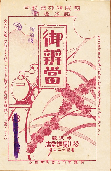 1943(昭和18)年頃のものと思われる、昔の昔の米沢駅弁の掛紙。30銭の停止価格が40銭の公定価格に訂正されており、1943(昭和18)年8月の駅弁の30銭から40銭への値上げを反映したものに見える。国民精神総動員と節米運動という戦時の文字が見えるが、それ以外に戦時を思わせる絵柄や文字は見られない。汽車が普通に山中を走り、おそらく奥羽本線の板谷峠を越えている。