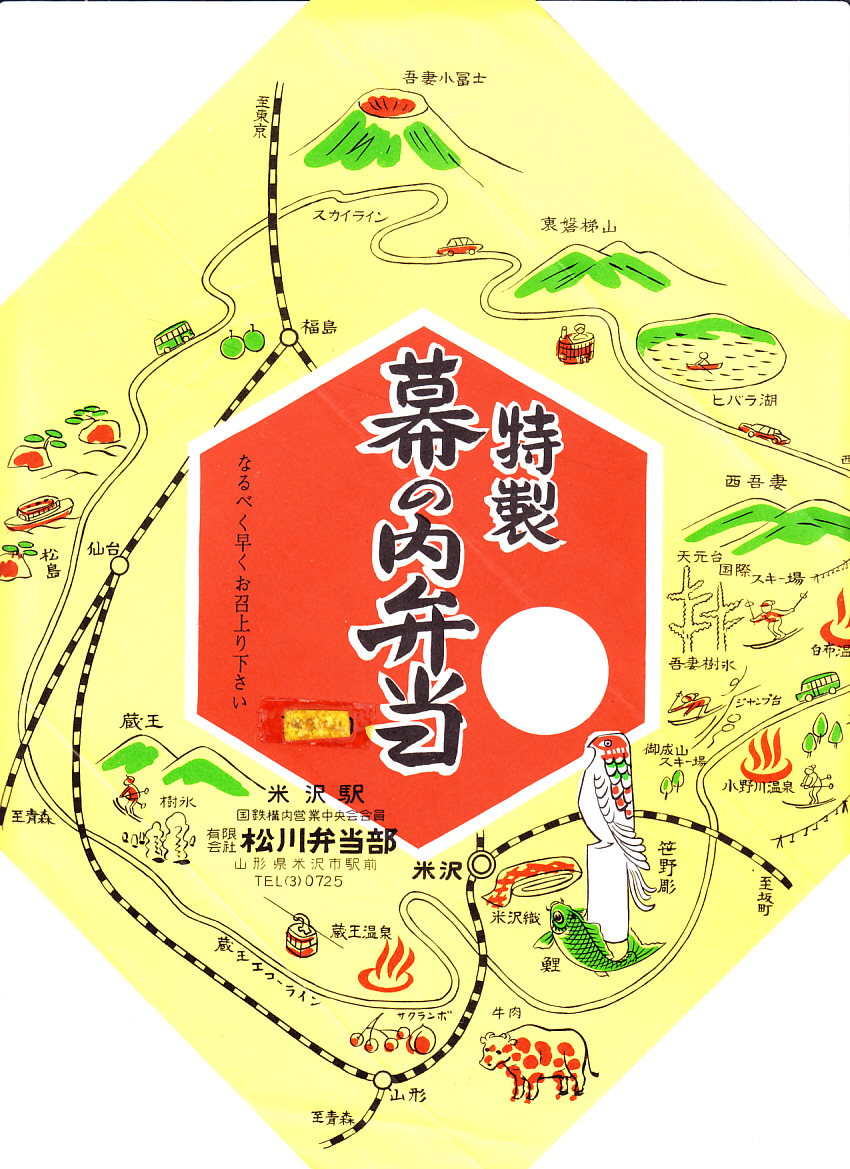 1970年代のものと思われる、昔の米沢駅弁の掛紙。価格が隠されていて分からない。米沢の山と名所と鉄道路線図を、赤い六角形の商品名の周囲に収めている。