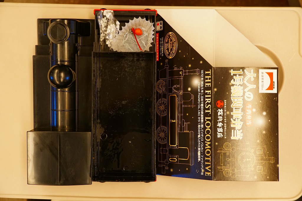 従前の1号機関車弁当と同じ、鉄道博物館に収蔵される1872年の日本の鉄道開業時の蒸気機関車を模したプラ容器を、ここでは商品名と蒸気機関車を描いた黒いスリーブにはめる。中身は白飯を、錦糸卵と糸こんにゃくと牛肉煮で覆い、しいたけ、ごぼう、紅生姜、グリーンピース、牛角切を載せ、スモークチーズとさくらんぼを添えるもの。牛角切と紅生姜は、蒸気機関車の燃料である石炭と、その燃える炎をイメージしたのだと。鉄道車両型容器の駅弁にありがちなお子様ランチではないけれど、「大人の」というほど大人向けでもなく、だれでも食べられそう。