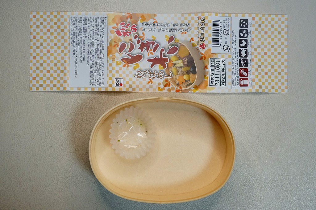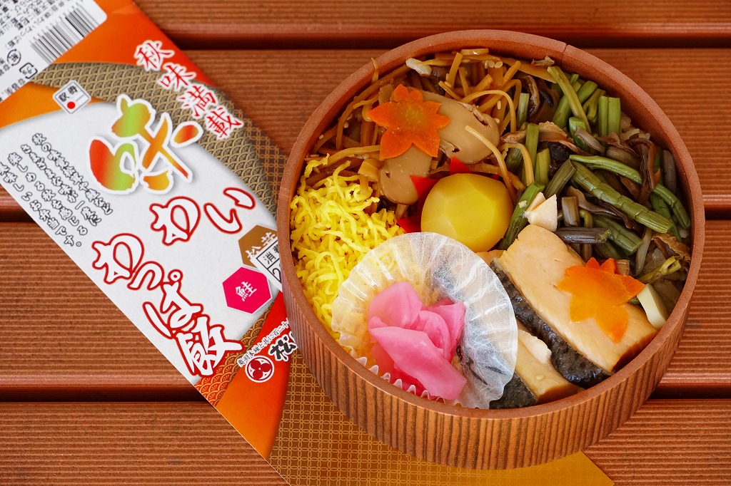 秋冬の駅弁大会シーズンに向けた、2020(令和2)年秋の新商品か。米沢駅でなくこのように、東京などにある各地の駅弁を売る売店か、駅弁大会で売られる弁当だと思う。真ん丸の容器に炊込みご飯を詰め、多くの山菜やきのこと、少々の鮭塩焼と栗で覆い、錦糸卵と大根桜漬で彩る。秋の弁当かと問われれば、そうだとは思う。価格は2020年の発売時で1,100円、2022年時点で1,130円。