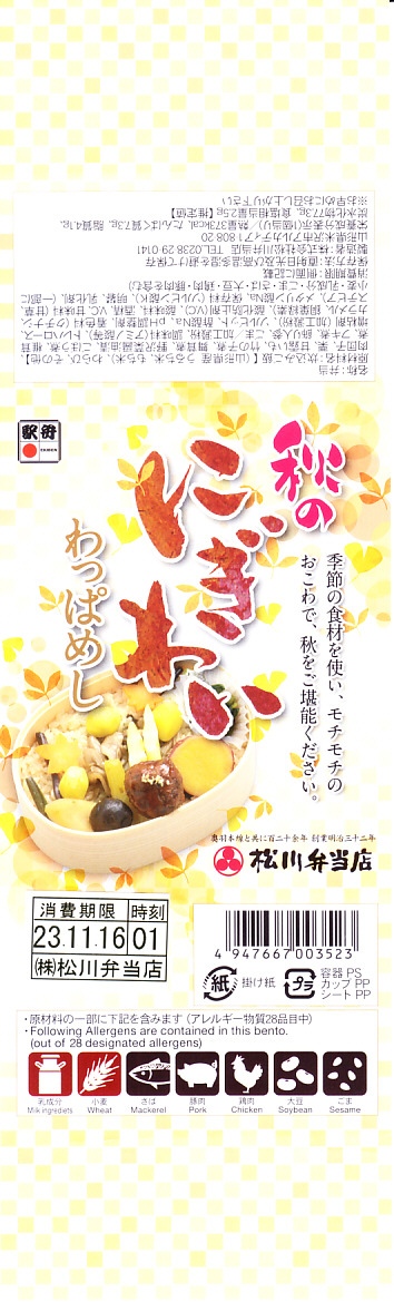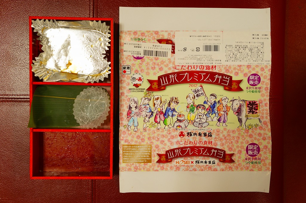 東京都千代田区の法政大学経営学部小川孔輔ゼミと調製元との共同開発により、2011(平成23)年10月15日から11月末まで、おそらく主に東京エリアで販売された期間限定駅弁。長方形の発泡材容器に、ゼミの先生と生徒を描いたという紅葉柄の掛紙を巻く。中身は山形米「つや姫」の白御飯に米沢牛カルビ焼肉を載せた牛丼と、赤豆の俵飯に赤カブや長ナスなどの漬物と、米沢牛入りの芋煮。
